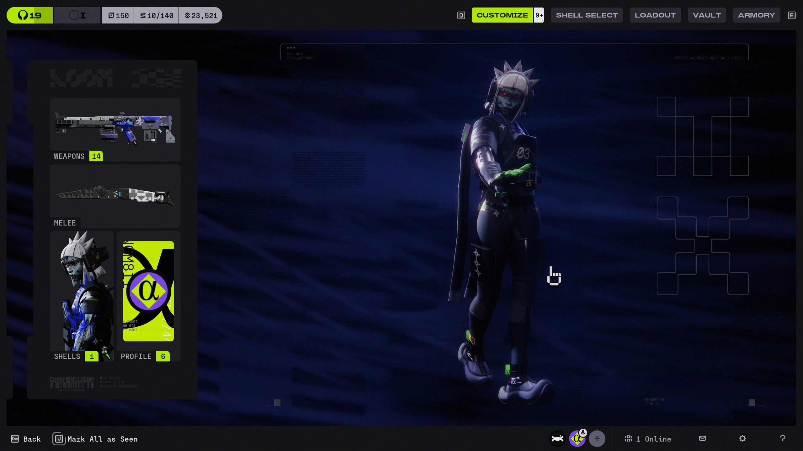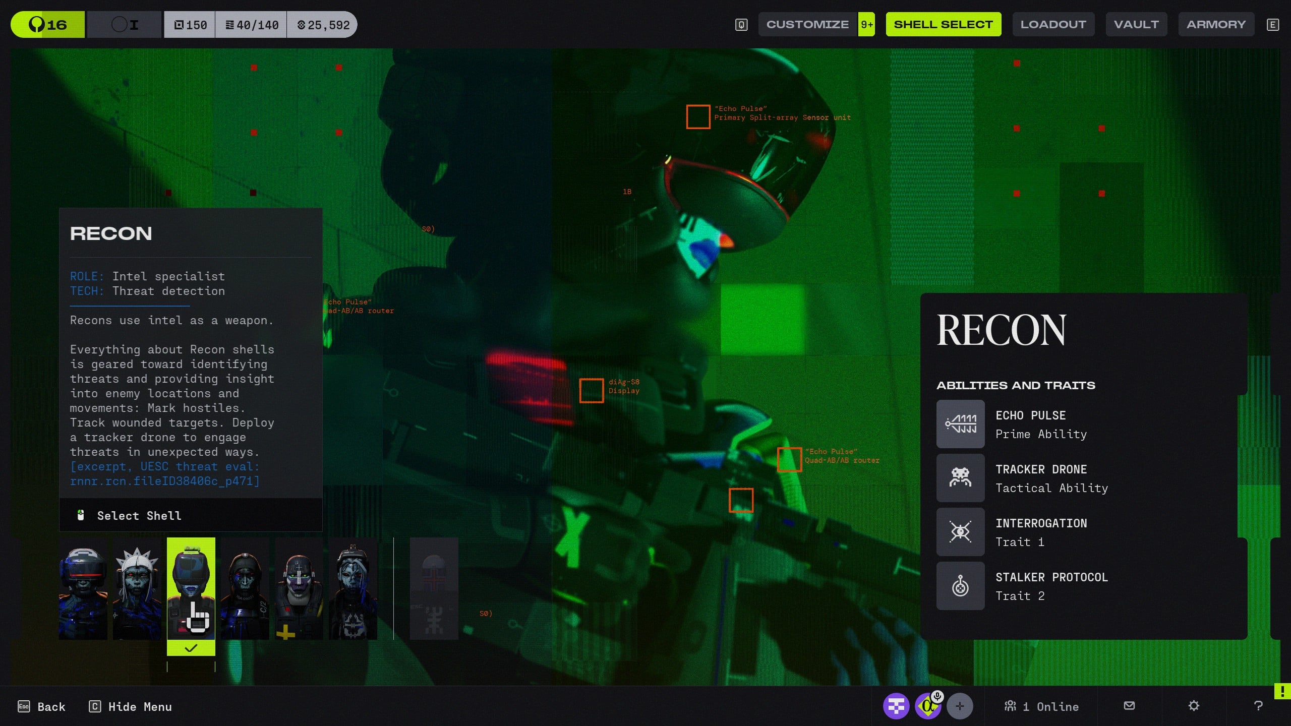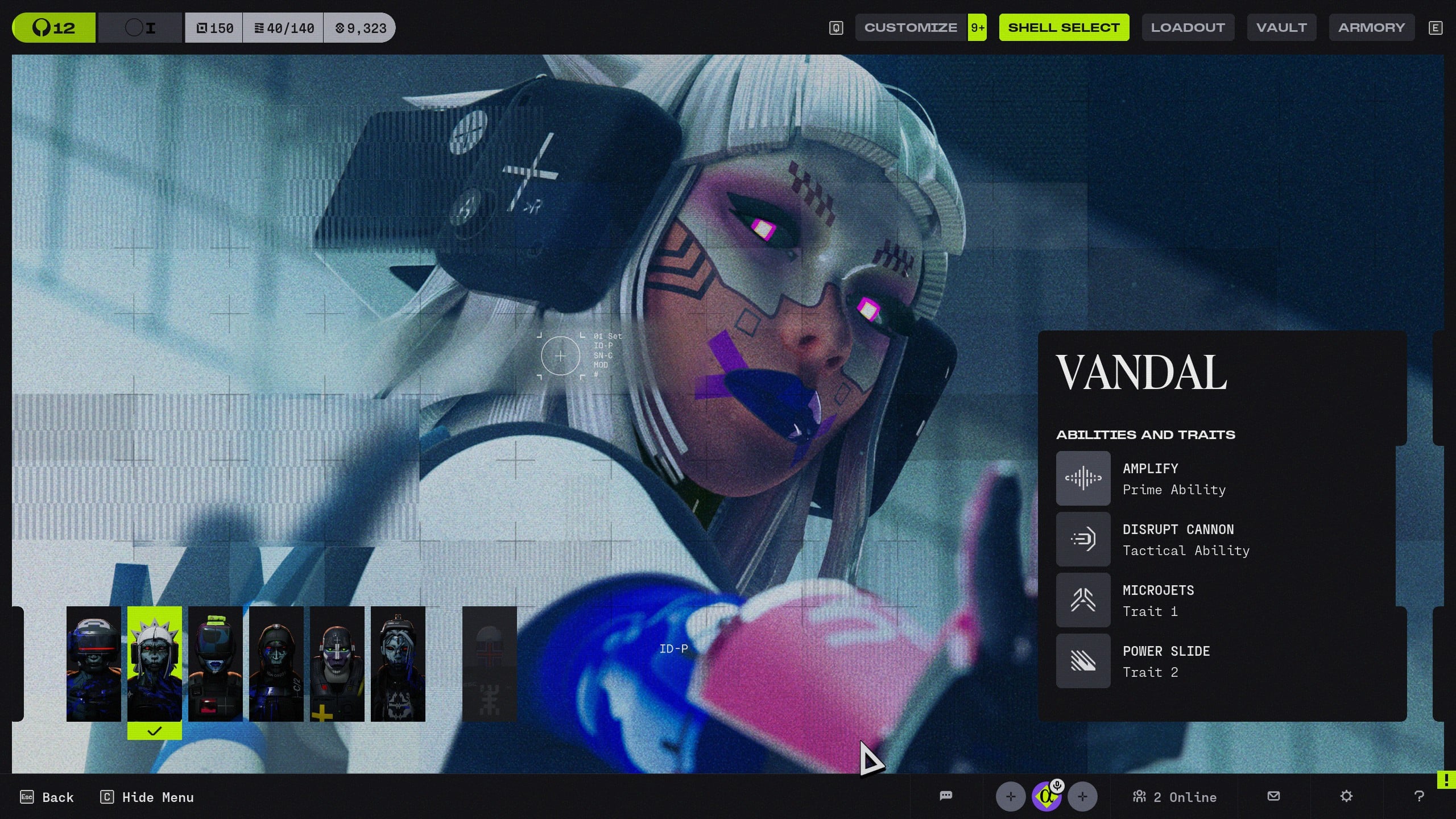 A másik, az utolsó opció a beállításokra, az nem más, mint a shell maga. A vázunk, amivel lemegyünk egyfajta „hero shooterré” teszi a játékot. A teljesség igénye nélkül van olyan héj, ami gyógyít, van amelyik robbant, van, aki láthatatlan tud lenni, de akad olyan is, aki a felderítésben erős. Az egyik kedvenc shellem a Vandal, ami képességeinek hála képes duplán ugrani, becsúszni, és mindenkinél gyorsabban futni is. Emellett viszont van támadó kepessége is, a karjából egy kisebb rakéta lőhető ki, ami teljesen feltöltve nagy területre ható robbanást idéz elő.