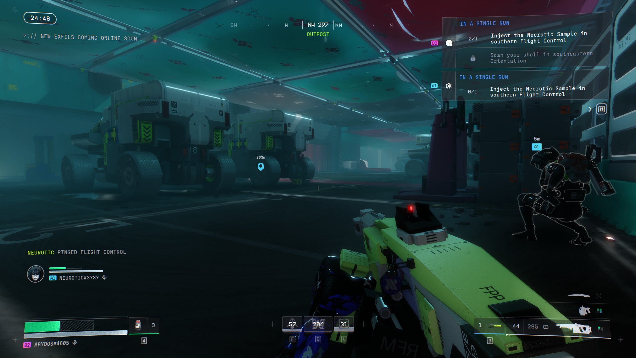 A kivonási pont is kicsit máshogy működik a játékban, mint a megszokott. Azokban a játékokban, amit próbáltam, a kivonási pontokhoz odamegy az ember, és ha túléli kb. 10 másodpercig, akkor ki is jut. Itt azonban aktiválni kell ezeket, nagyjából egy percig zajosan, nagy fénnyel működnek, ami erős jelzés mindenki más számára a pályán, hogy itt bizony valaki jelentős summa reményében menekülni készül. Ha sikerül az egy percet túlélni, akkor utána még 10 másodpercet a kivonási zónában kell maradni, majd csak utána hagyhatjuk el a pályát. Ennek a kivonási cuccnak van egy nehezített változata is, a védett kivonási pontok, ilyenkor ugyanis az UESC robotok nagy hajókkal érkeznek, és bizony az életünkre törnek.