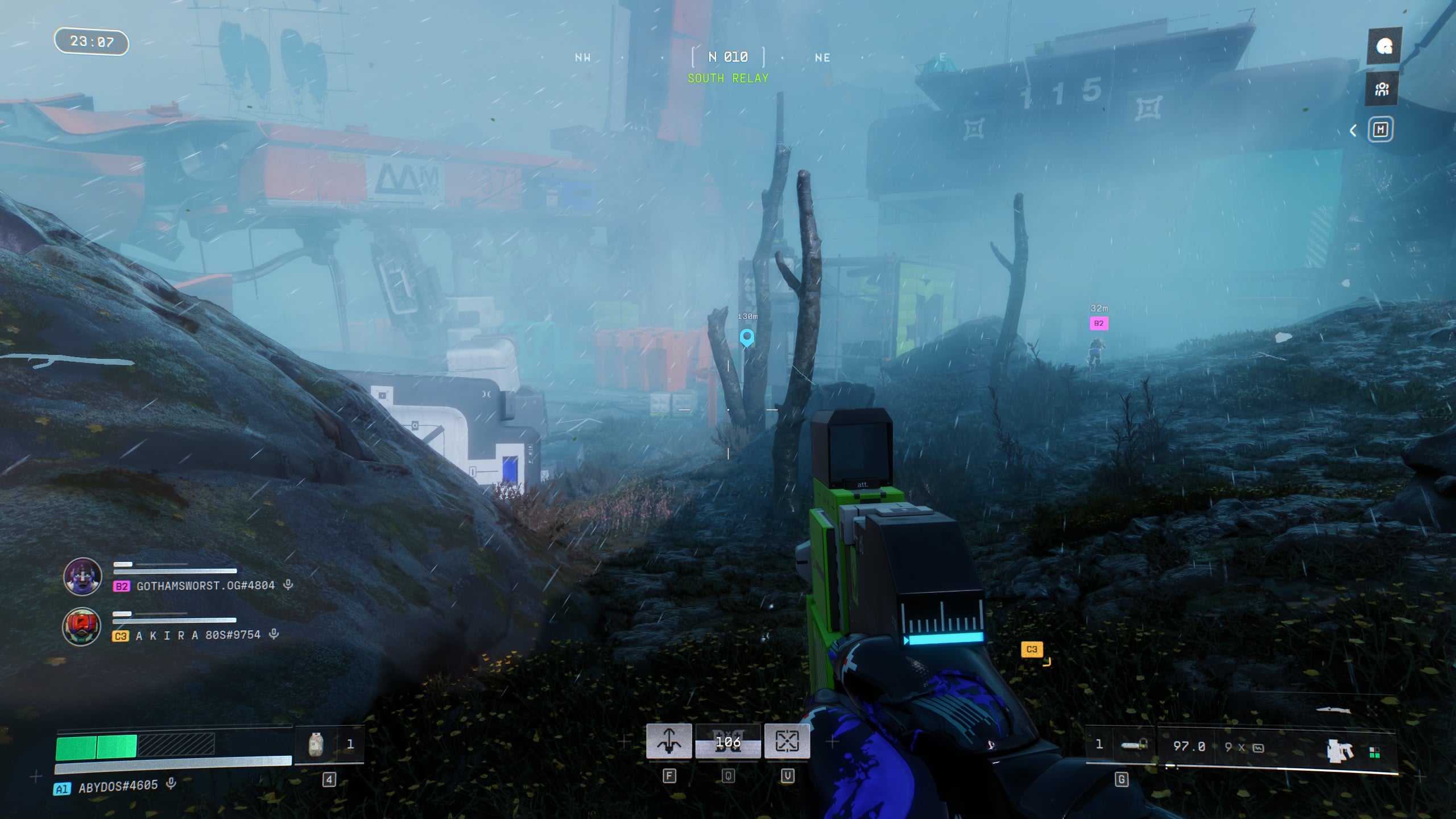 A fáradtság itt ugyanis túlhevülés. Ha sok, jelentős hőt termelő mozgást csinálunk, mint amilyen a futás, ütés vagy a csúszás, akkor bizony a testünk felhevül, és egy ideig belassulunk. Érdekes megközelítése ez a stamina rendszernek, hiszen pont emiatt, ha az időjárás kint hideg, esős vagy vizes, akkor a shell hamarabb le tud hűlni, tovább tudunk ilyenkor futni. Merthogy az időjárás sűrűn változik, egyik run során hatalmas eső, másikon nagy köd, harmadikon pedig tikkasztó hőség vár minket. Mindegyik eseménynek megvan a maga szerepe, a vihar elnyomja a hangot, a tiszta idő viszont veszélyesebbé teszi a környéket, a láthatóság miatt a szabadban való futkosás remek agyaggalambbá tesz minket a mesterlövészek számára.