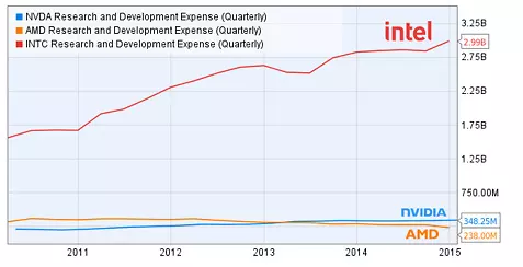 Az adatok szerint az AMD kutatásra és fejlesztésre szánt költségvetése 2012 óta csökken, így jelenleg a 2004-es szintet ostromolja. De ez nem mindig volt így. 2011 elején az AMD még 100 millió dollárral az Nvidia előtt járt, viszont az Nvidia illetékesei nem sokkal később szélesebbre nyitották a cég pénztárcáját. Az AMD 2011 folyamán stagnálásba kezdett, majd 2012-ben elindult a lejtőn: manapság az Nvidia pont akkora előnyben van, amekkorában 2011 folyamán az AMD volt, ugyanis 348 millió dollárt költ kutatásra és fejlesztésre, szemben az AMD-vel, aki 238 millió dollárt szán erre a célra. Az Nvida a teljes árbevételéhez viszonyítva is többet költ kutatásra és fejlesztésre, mint az AMD: ez az érték a Nvidia esetében 31%, az AMD-nél viszont csak 20% (a konkrét összegek egyébként negyedéves bontásban értendőek).