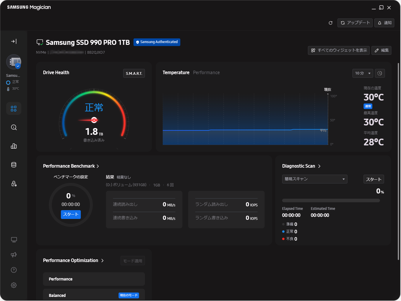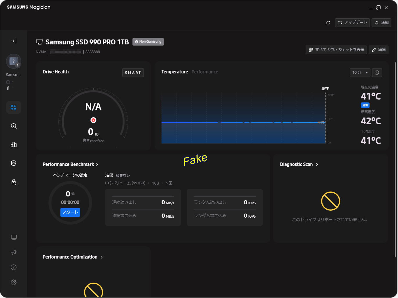 A legegyszerűbben úgy lehet lebuktatni az efféle aljasan profi hamisítványokat, hogy elindítjuk a Samsung ingyenes alkalmazását, az SSD Magician szoftvert, amit nem téveszt meg az a tény, hogy a hamis SSD meghajtó is 990 Pro névvel rendelkezik: az alkalmazás rögtön tájékoztat, hogy nem egy Samsung gyártmányú SSD-vel van dolgunk. A firmware verziója szintén beszédes, a szokásos karaktersor helyett 8888888 jelölést visel, ami nem egy jellemző verziószám. A hamis SSD-nél olyan gyári funkciók sem érhetőek el, mint például a diagnosztika, a teljesítmény-optimalizáció, az adattitkosítás, valamint az 5 év gyártói garancia sem áll rendelkezésre.