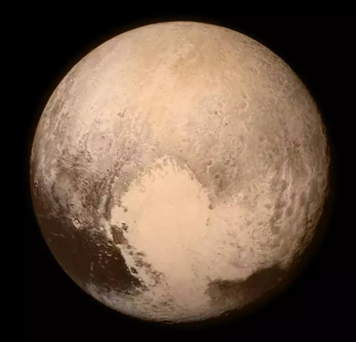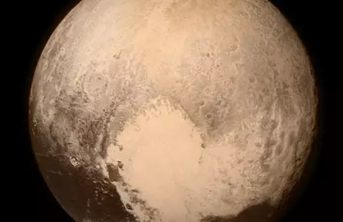 Ami a legnagyobb megközelítés előtti utolsó hazasugárzott fotót illeti, azon egy rendkívül változatos világ bontakozik ki, amely messze meghaladja az előzetes várakozásokat. Az alacsonyabb felbontású felvételeken észlelt„szív” ezen a 766 ezer kilométeres távolságból készült képen már két jól elkülöníthető régióra bomlik fel, egy nagyon sima bal oldali, és egy jóval göcsörtösebb jobb oldali területre. A bal oldali részről a földi spektroszkópos mérések alapján már korábban is tudták a szakértők, hogy azt nagyrészt fagyott szén-monoxid borítja, de mindenképpen érdekes, hogy ez a régió milyen élesen elkülönül a látható fényben készült felvételeken is. Ez a világos folt egyébként már a Hubble felvételein is látszott, és pontosan ezért vették célba az említett régiót a szakértők a Pluto amikor a legnagyobb felbontású felvételek helyét kijelölték.