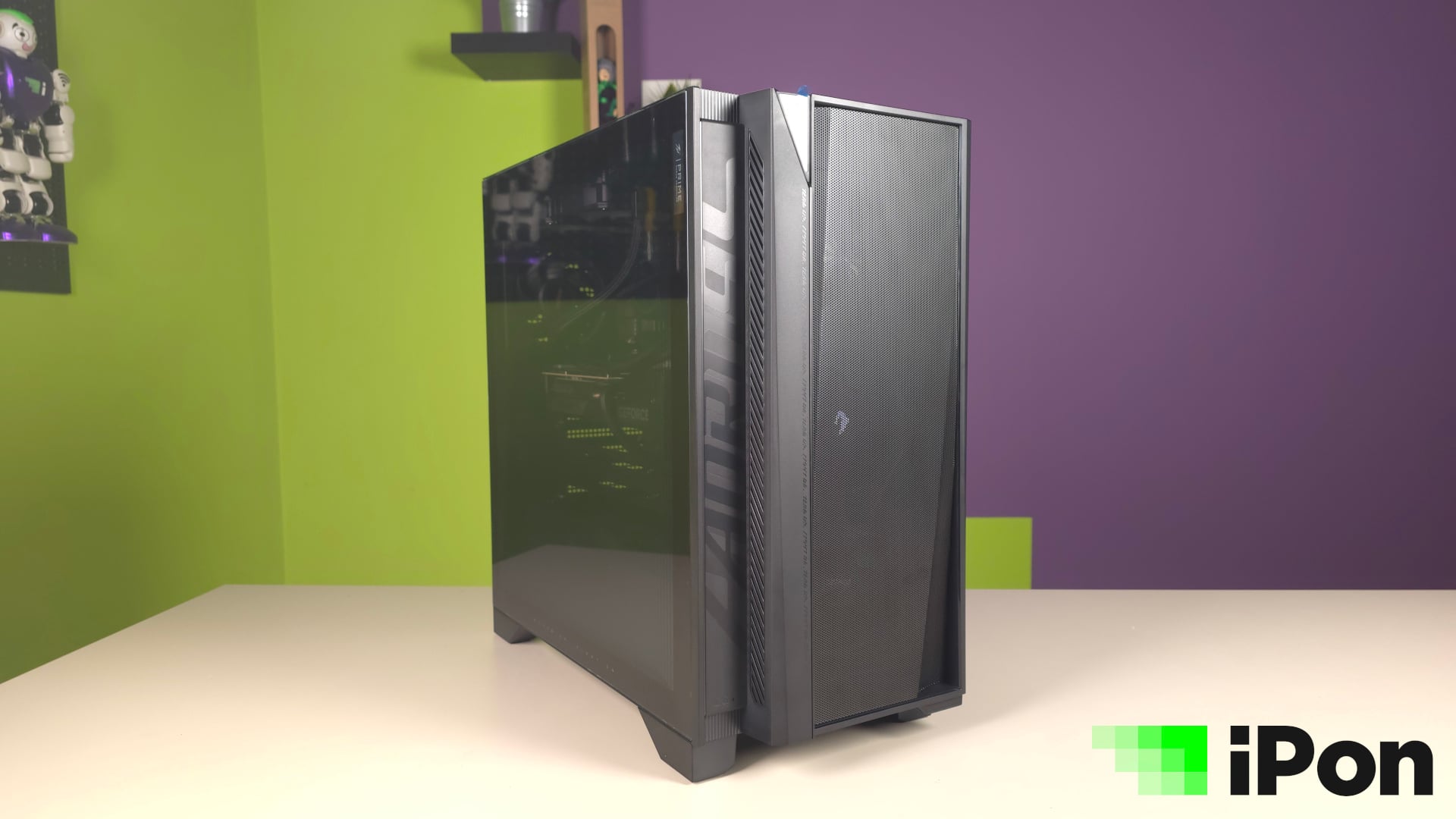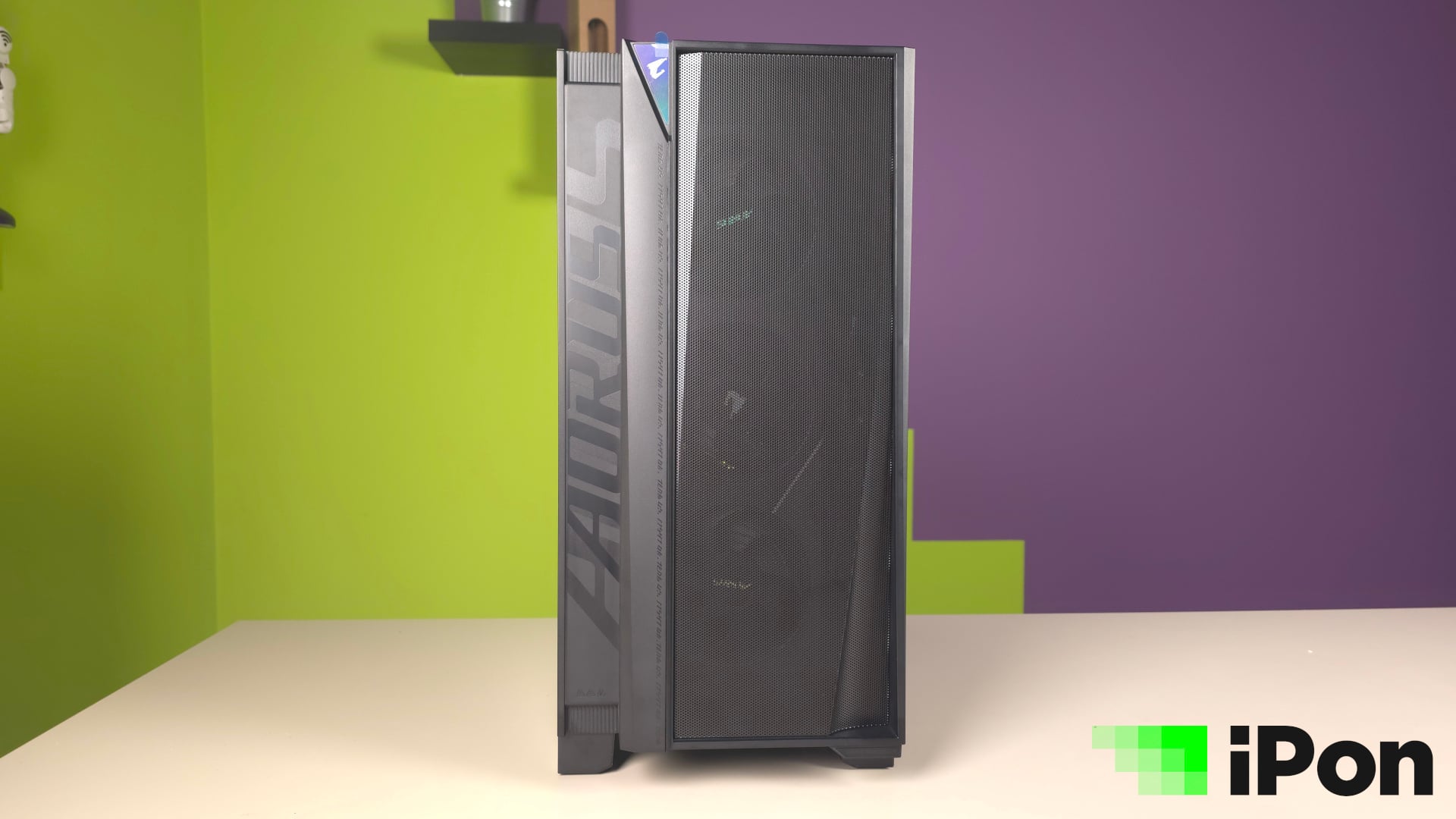 Az előlapi dizájn egészen visszafogottnak mondható, de brand-PC lévén azért nem nélkülöz egy méretes AORUS feliratot, melyet függőlegesen, a bal oldali sávon helyeztek el. Az előlap nagy részét a mesh előlap uralja, azon átszűrődve pedig három fénykör jelzi az RGB-s ventilátorok jelenlétét.