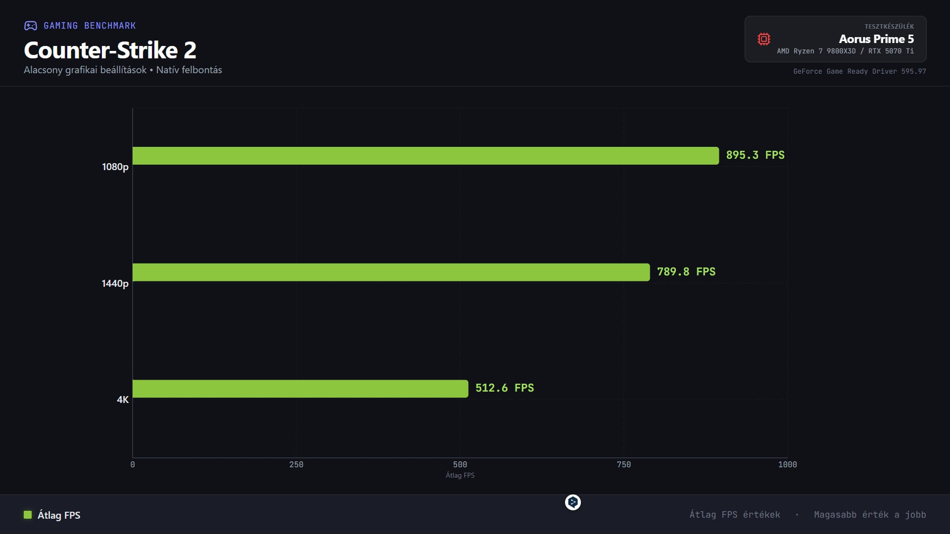 A Counter-Strike 2 rajongóinak jó hírem van, bár meg is lepődnénk, ha egy 400 ezres kártya nem hozna szép eredményeket. 1080p-s felbontáson és minimumra húzott vizuális beállítások mellett közel 900 fps-t kaptam, de még 4K-ban is 500 fölött volt az átlag, szóval nem igazán találunk olyan fejlett gamer monitort a piacon, amit ezzel a géppel ne tudnánk teljes mértékben kihasználni.