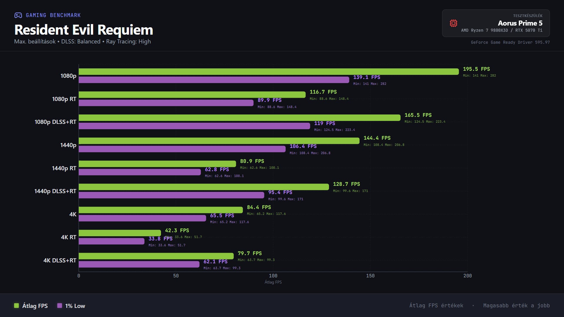 Amennyiben nem ragaszkodunk a Ray Tracing bekapcsolásához, az új Resident Evil még natív 4K felbontáson sem igazán zuhan be 60 fps alá, ami kifejezetten biztató. Amennyiben viszont élnénk a realisztikusabb fény-árnyék hatásokkal, ugyanezt az eredményt legfeljebb 1440p-ben érhetjük el, ugyanakkor a DLSS aktiválásával még ha felskálázva és Balanced beállításon is, de az RT és a 4K is elérhető egyszerre, megfelelő képkockaszám mellett.