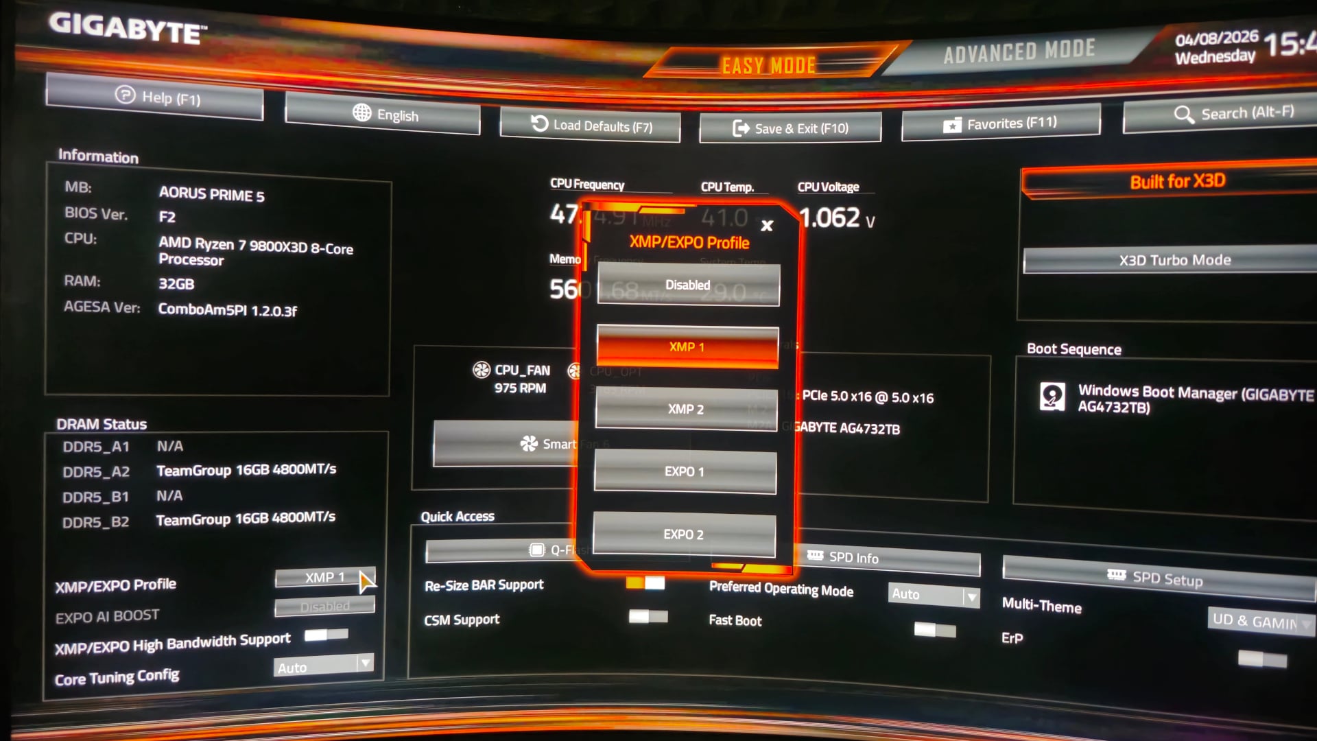 Az első bekapcsolást követően a BIOS-ba vezetett az utam, melyben láttam, hogy a memóriák nem a túlhajtott állapotukban dolgoztak, így gyorsan beállítottam az EXPO profilt a megfelelő időzítések és sebesség eléréséhez.