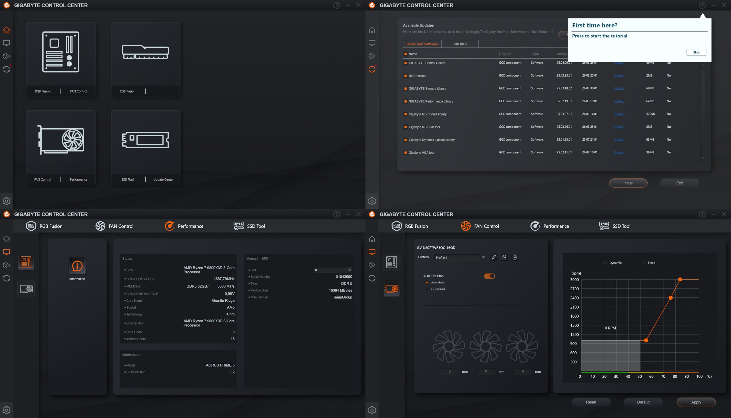 Az előre telepített Gigabyte Control Center meglepően letisztult felületet kapott, egészen kellemes a szemnek és nagyjából a legszükségesebb elemekre szorítkozik, így nem fog összeakadni a szemünk, amikor megnyitjuk.