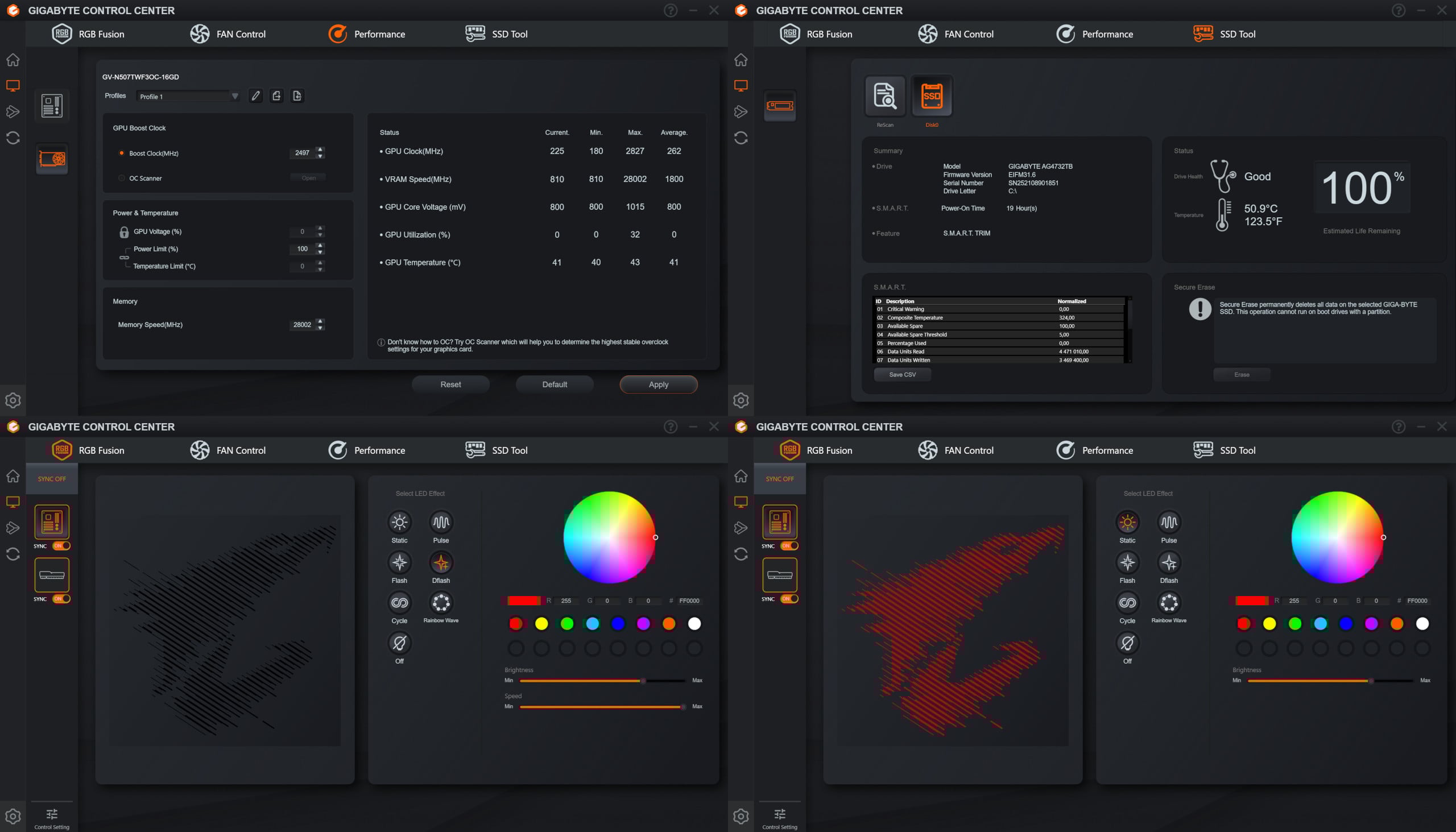 Itt lényegében a rendszerventilátorok és a videokártya légterelőinek fordulatszámát és viselkedését szabályozhatjuk, pepecselhetünk az összehangolt RGB-vel, sőt, még tuningopciókat kapunk a CPU és a VGA számára.