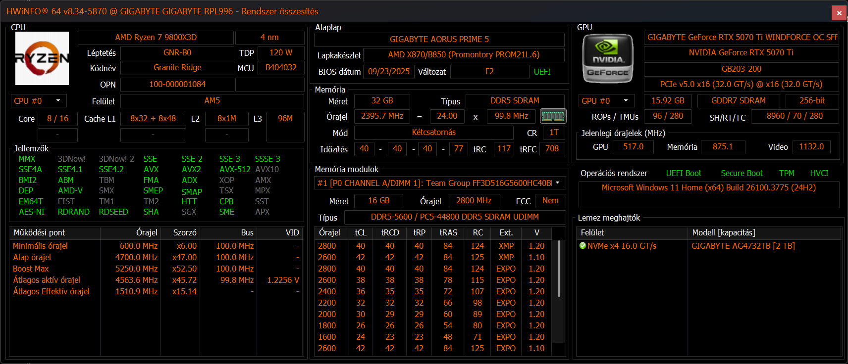 A videokártya a felsőbb szegmensből származik, hiszen nagyjából 20-25% választja el az RTX 5080-tól, tehát még így is egy kellően potens hardverről beszélhetünk. Számomra egyedül a gyártó által választott RAM-ok voltak kicsit furcsák, az 5600 CL40-es moduloknál azért biztosan belefért volna a keretbe egy fokkal feszesebb időzítésekkel ellátott KIT is.
