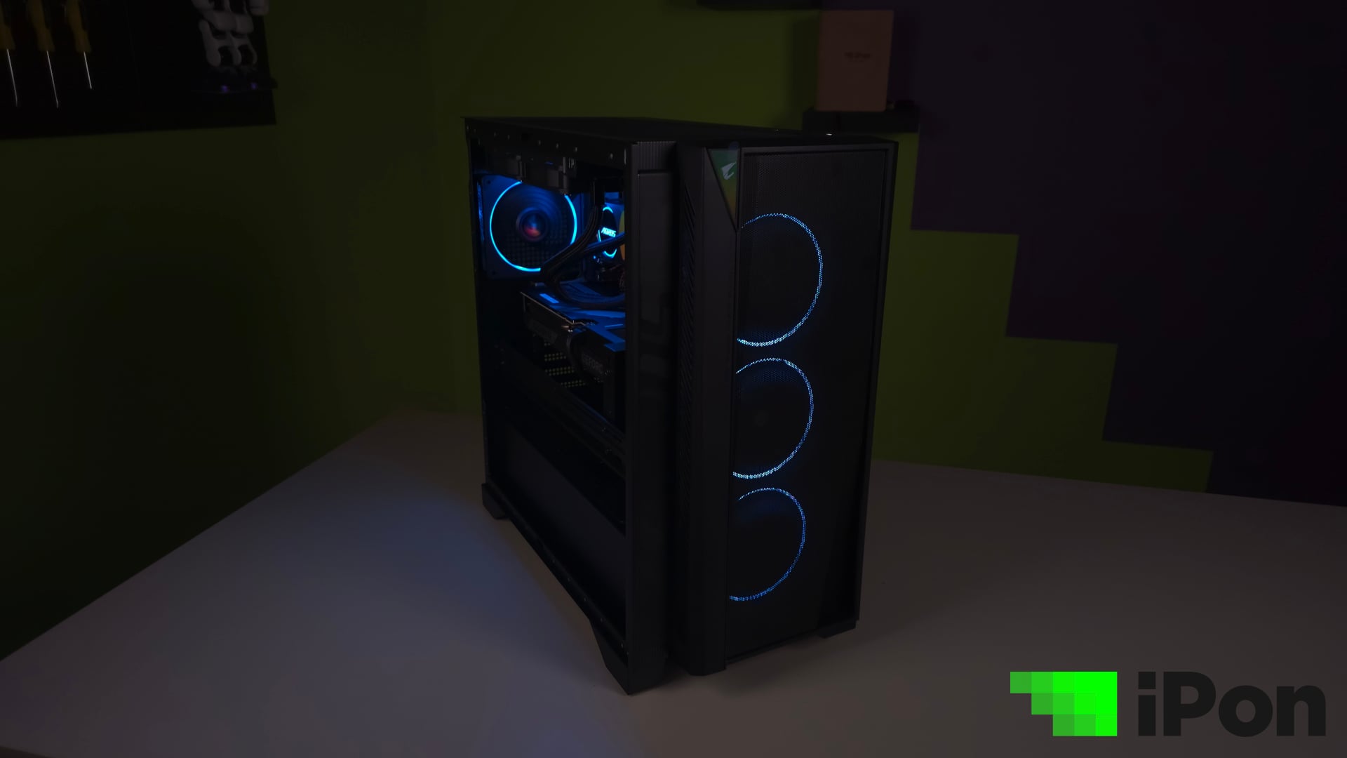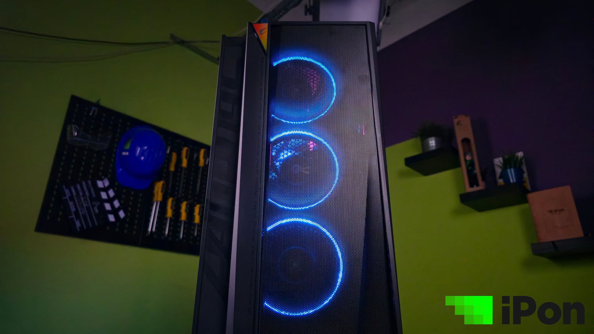 Amúgy hűtés szempontjából egy egészen érdekes megoldással éltek, ugyanis nem csak a processzor kapott egy all-in-one hűtőt, de az előlap mögött világító három ARGB-s karikát is egyetlen, egybeépített keret fogja össze. Ez nem éppen egy szokványos húzás, mivel egyfelől szerelés és bekötés szempontjából nagyon kényelmes, ám ha bármelyik forgólapát megsérül vagy meghibásodik a három közül, akkor az egész elemet vehetjük ki és cserélhetjük le.