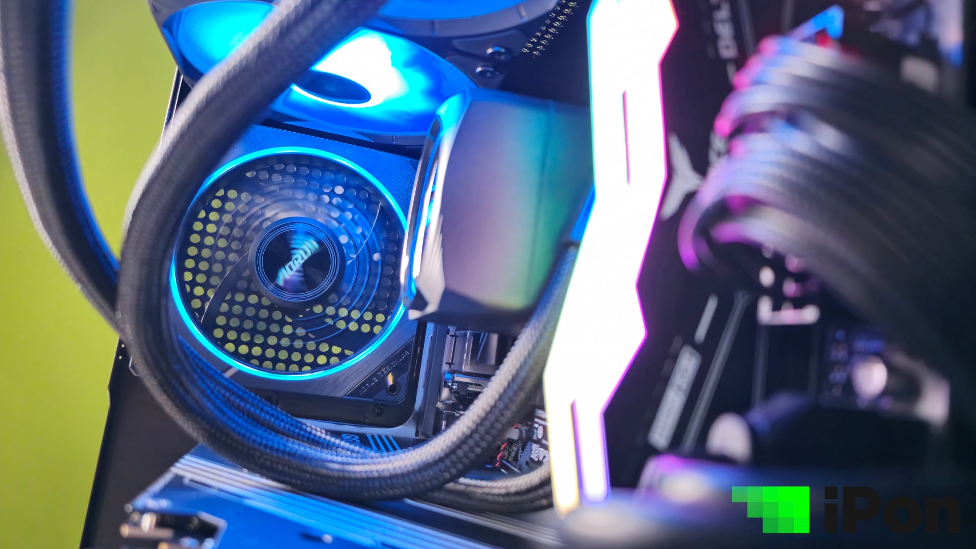 Természetesen a processzor is AIO hűtőt kapott, bőséges mennyiségű RGB-s fénnyel ellátva, ám itt a lapátok már fehérek, szóval a világítás is jobban érvényesülhet. Bár a radiátor nem 360-as, csak 240-es, a 9800X3D elviekben tökéletesen lehűthető ennyivel is és így egy forgólapátnyival kevesebb zaj keletkezik.