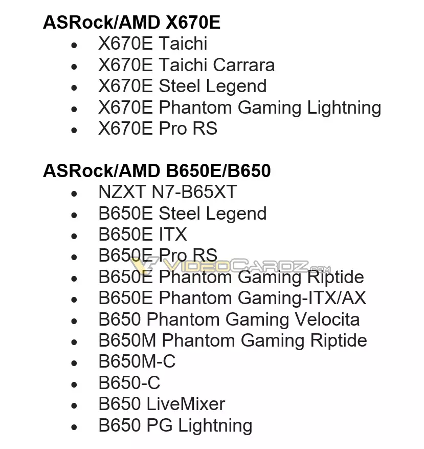 Az ASRock kínálatában már többféle B650E lapkakészlettel szerelt alaplap is lesz, ugyanis nem kevesebb, mint ötféle ilyen modell piacra dobását tervezi a gyártó, mellettük pedig hét darab B650-es alaplapból is választani lehet. Ezek a termékek a már megszokott Pro, Phantom Gaming, PG Riptide, illetve PG Velocita sorozatokban kapnak helyet, de új neveket is használ majd a gyártó, amelyek között a LiveMixer és a PG Lightning foglal helyet. Mivel az ASRock gyártja az NZXT alaplapjait is, egy NZXT márkanévvel ellátott termék is szerepel a listán.