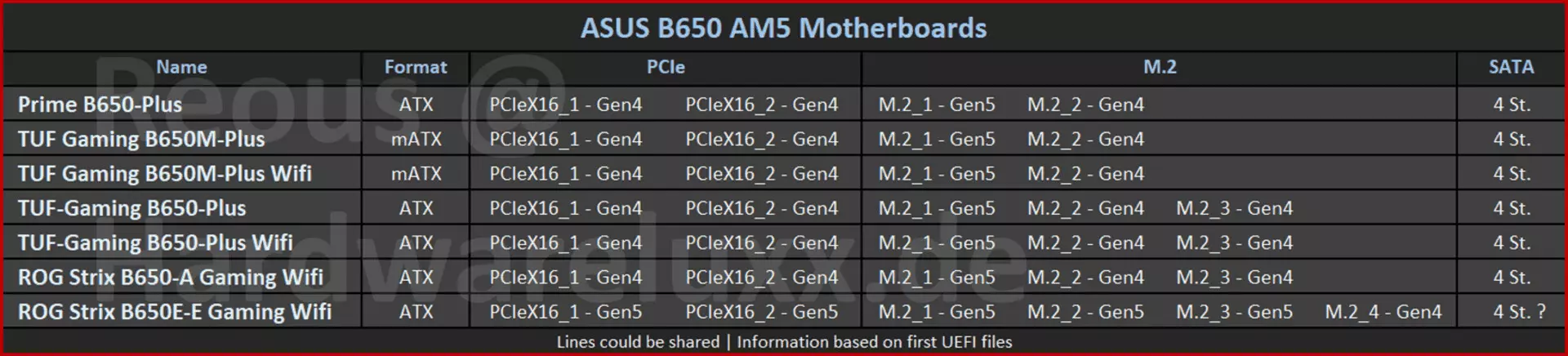 Az ASUS háza táján eleinte hétféle alaplap épül a B650/B650E lapkakészletek köré, amelyek közül egy a Prime, kettő a TuF Gaming, kettő pedig a RoG Strix sorozatot erősítheti. A felsoroltak közül csak egyetlen egy modell lesz B650E alapú, a RoG Strix B650E-E Gaming Wi-Fi, az összes többi már a B650-es lapkakészletre támaszkodik. A B650 alapú deszkák mindegyike egyetlen PCI Express 5.0 x4-es M.2-es slottal rendelkezik majd, az összes többi bővítőhelyük PCI Express 4.0 alapú lesz; a PCI Express 5.0 x16-os slotot csak az említett B650E alapú termék kapja meg, szám szerint rögtön kettőt.