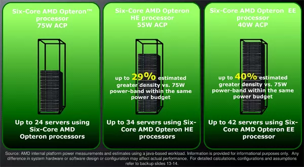 Az új chip egyébként az Intel 60W-os fogyasztás mellett üzemelő négymagos, Nehalem alapú Xeon processzoraival veheti fel a versenyt. Itt is érdemes megemlíteni, hogy az Intel és az AMD mérései a fogyasztást illetően eltérőek, azaz a 40W-os ACP értékkel rendelkező AMD újdonság tulajdonképpen 60W-os TDP-vel bír (ám szerintük az Intel TDP-je megegyezik az ő ACP-jükkel, mert átlag értéket képvisel, nem maximálisat).