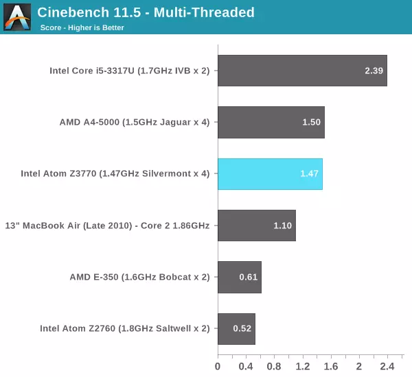A Twitteren megjelent bejegyzés alapján az Intel Atom Z3770-es SoC egység a CineBench R11.5-ös kiadásában, az összes rendelkezésre álló szálat megdolgoztató tesztben 1,47 pontot kapott. Az sajnos nem derült ki, hogy az új SoC egyszálas teljesítménye pontosan hogyan alakul, de ez aligha véletlen.