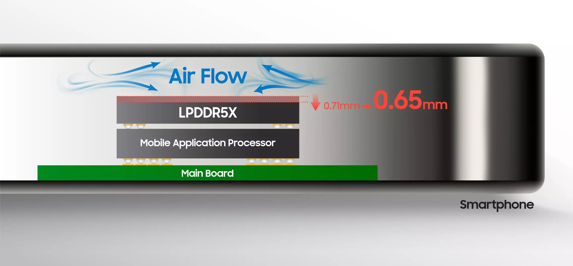 Arra hegyezte ki a Samsung a legújabb LPDDR5X modult, hogy minél vékonyabb legyen, mindössze 0,65 mm magas lett az újdonság.