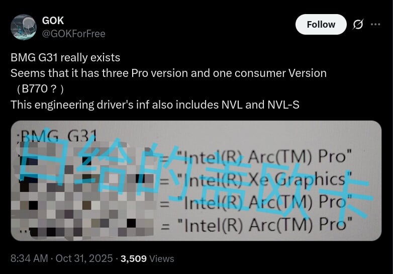 Egy mérnöki driverben bukkantak rá a BMG-G31-es GPU-ra, ami egyebek mellett az Arc B770 alapját is adhatja, de professzionális szintű videokártyák is készülhetnek vele. A driver kódja összesen négy lehetséges verziót listázott, ami alapján úgy tűnik, az Intel csapata háromféle modellel veheti célba a professzionális videokártyák szegmensét, a negyediket pedig a gamereknek készíthetik. Ez igazából logikus és életképes lépés lehetne, hiszen a háromféle modellel három, egymástól eltérő professzionális felhasználói réteget vehetnek célba, ennek megfelelően alakítva a GPU aktív komponenseinek számát, a memória-alrendszert, illetve az NPU konfigurációt is. A negyedik verzió kiválóan alkalmas lehet arra, hogy költséghatékony alternatívát teremtsen a piacon kapható rivális modellekkel szemben, ehhez viszont megfelelő árazásra és jó ár/teljesítmény arányra lesz szükség, ami nem egy egyszerű feladat – főleg ekkora késés után, hiszen azóta a piac átalakult egy picit.