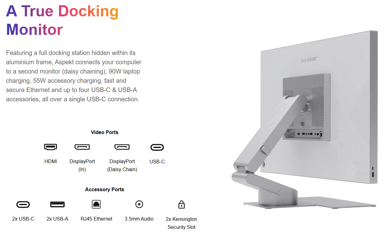 Az alumíniumház egy teljes értékű dokkolót tartalmaz, ami 90 W-os töltőteljesítményt kínál a noteszgépek számára, valamint 55 W-os töltőteljesítménnyel szolgálja ki az egyéb eszközöket. A dokkoló kapott két USB-C és két USB-A portot, valamint egy Ethernet port és egy 3,5 milliméteres Jack Audió csatlakozó is van rajta. A gyártó szerint ez az első monitor a világon, ami 145 W-os töltőteljesítményt kínál a különböző eszközök számára.