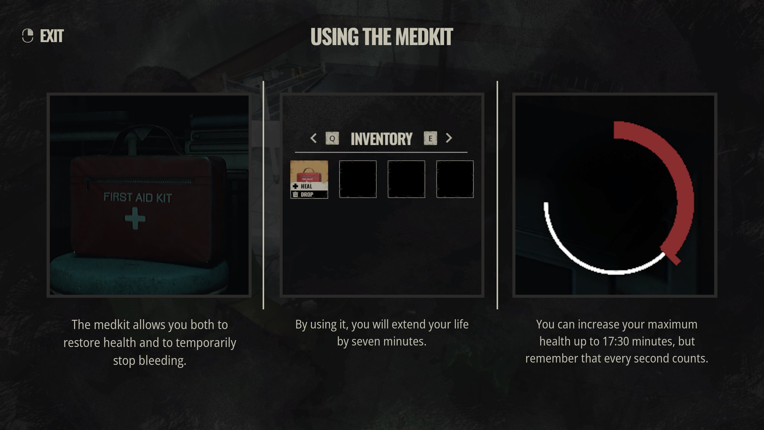Szintén érdekes erőforrás az elsősegély láda, amivel 7 perccel megnövelhetjük az életbenmaradásunkat, de figyelmeztet a játék, hogy 17:30 perc a maximum „életerőnk”, vagyis ne pocsékoljuk. Hasznos mechanika még, hogy a mentőpontot tartalmazó szobába való visszatérés, az időnket is visszadobja 5:15-re, vagyis egy utolsó pillanatos időzítéssel jól kihasználható, hogy időt nyerjünk egy rész további felfedezéséhez, vagy egy ponthoz való visszatéréshez.
