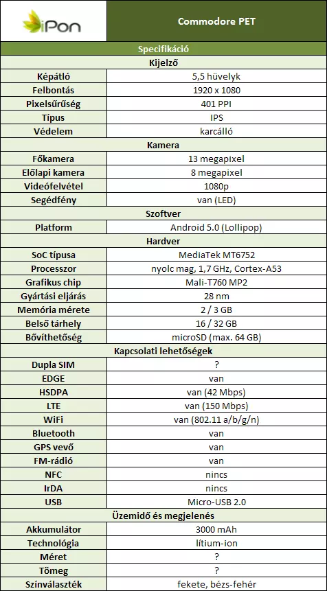 Az újdonságot egy MediaTek MT6752 lendíti majd mozgásba, ami 1,7 GHz-es órajelen teszi a dolgát. Ez a SoC természetesen már 64 bites, nyolc darab egyenrangú Cortex-A53 processzormag lapul benne egy Mali-T760 MP2 grafikus feldolgozó egység mellett. A háttértár és a rendszermemória tekintetében kétféle kivitelből lehet majd választania a vásárlóknak. Az alapgép 16 GB-tal kecsegtet, amihez 2 GB-nyi RAM társul, ha pedig ez valakinek kevés lenne, lecsaphat rá 3 GB-os rendszermemóriával és 32 GB tárkapacitással is. Bővíthető a készülék, legfeljebb 64 GB-os microSD kártya csúsztatható bele problémamentesen. A kapcsolati képességek lajstromán egyetlen extra fedezhető fel, mégpedig az FM rádió, melynek köszönhetően a zenéből sosem fog kifogyni a PET. A mobil tartogat még egy négyes kategóriájú 4G LTE hálózati modemet (150/50 Mbps), Bluetooth 4.0 modult, A-GPS vevőt és persze 802.11 a/b/g/n szabványoknak megfelelő Wi-Fi-t is.