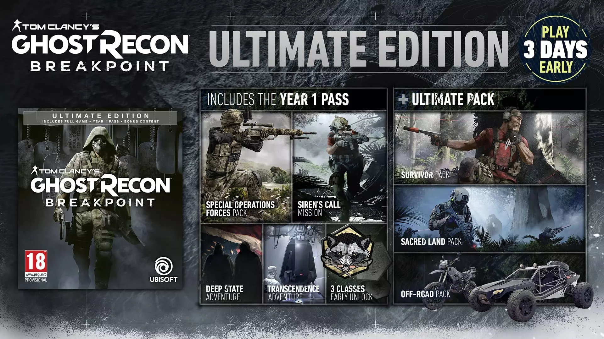 A Tom Clancy’s Ghost Recon Breakpoint 2019. október 4-én jelenik meg PlayStation 4-en, Xbox One-on és PC-n, ez utóbbi kizárólag a Uplayen és az Epic Store-ban, a Steamen nem. Az alapkiadás mellett választhatjuk az Ultimate Editiont is, mely a digitális extrák társaságában a korai hozzáférést biztosító Year 1 Passt és az Ultimate Packet is tartalmazza.