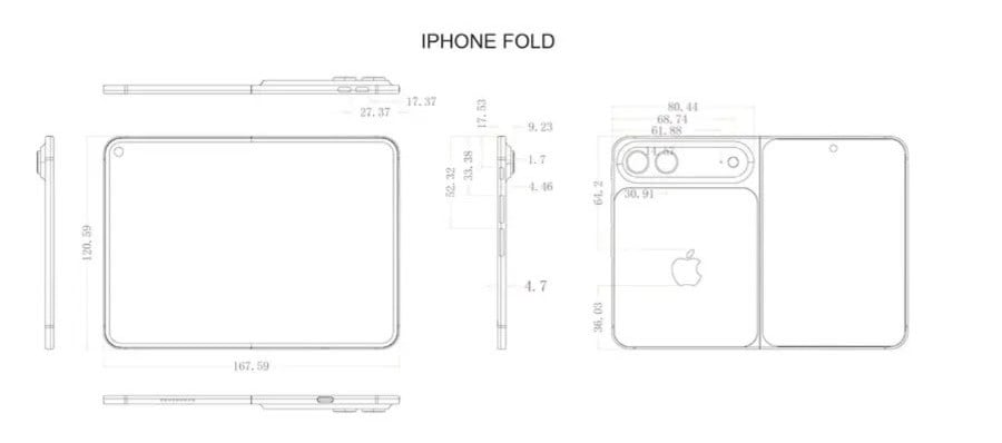 Az iPhone Fold kapcsán a napokban kikerült egy kép, melyen látható minden mérete nyitott állapotban. Ez alapján az Apple masinája 167,59 milliméter szélesre nyílik, míg a magassága 120,59 milliméter lehet. Alig mutat eltérést a Huawei által tervezett konstrukcióhoz képest. Azonban az iPhone Fold valamivel vékonyabbnak ígérkezik, állítólag csak 4,7 milliméterre emelkedik ki a síkból. Persze a kameramodulnál vaskosabb lesz, az optikáknál 9,23 mm-t mérethetünk majd.