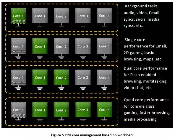A Variable SMP-hez tartozó technológiai leírásból kiderül, hogy az ötödik processzormag egyformán használatban lesz, amikor az adott mobil eszköz aktív készenléti módba lép, illetve olyan alkalmazásokat futtat, amelyek nem igényelnek nagy számítási teljesítményt. Az audió és videó lejátszás – legyen szó online, vagy offline módról – is az alacsony számítási teljesítményt igénylő feladatok közé tartozik, méghozzá azért, mert ezeket a funkciókat nagyrészt hardveres kódoló és dekódoló egységek látják el, nem processzormagok.