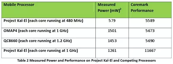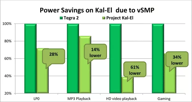 A lenti diagram szerint az ötödik magnak köszönhetően a Kal –El rendkívül energiatakarékosan üzemelhet, még takarékosabban, mint a Tegra 2 SoC, amely ugye csak két ARM processzormaggal bír.