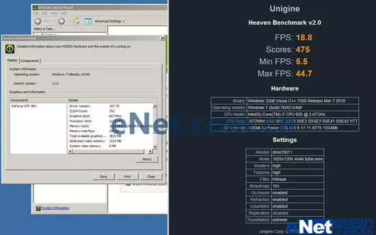 Az eNet tesztjei alapján a GTX 465 Far Cry 2 alatt gyorsabbnak bizonyul, mint a Radeon HD 5870, ám Crysis: Warhead tesztben lassabb még a Radeon HD 5830-asnál is. A tesszellációs képességekre kihegyezett Unigine Heaven Benchmark alkalmával a GTX 465 teljesítménye a Radeon HD 5850-é és a Radeon HD 5870-é között helyezkedik el.