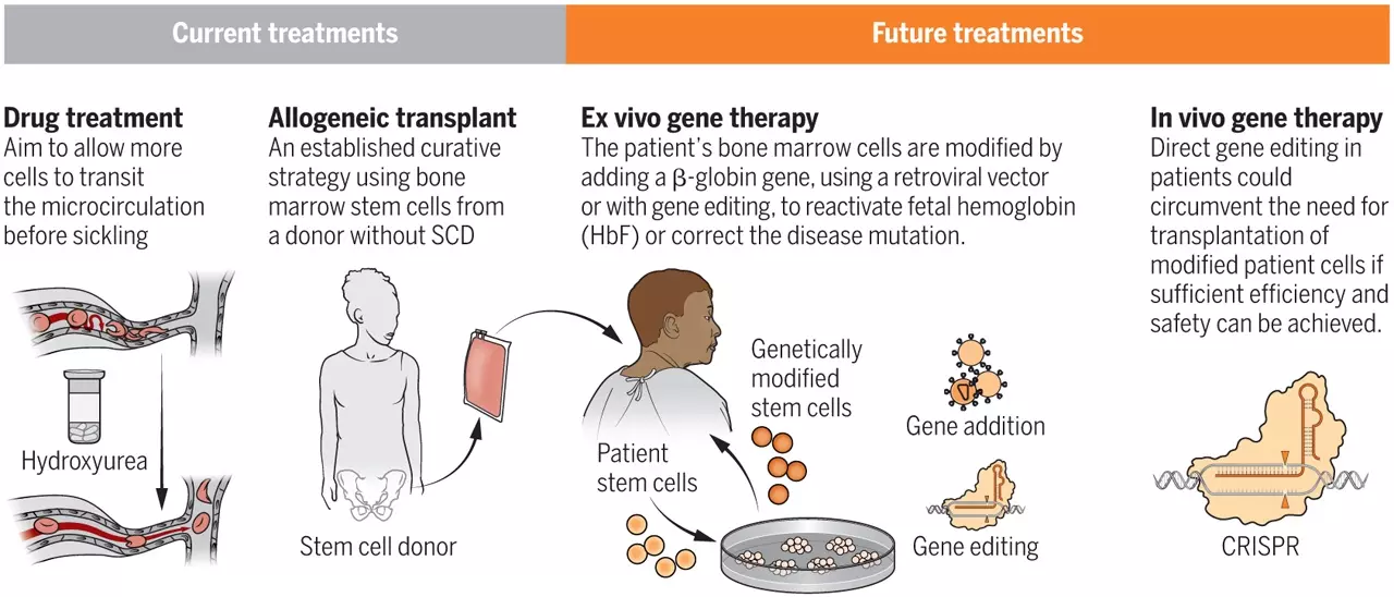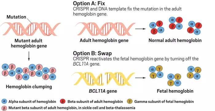 A CRISPR Therapeutics és a Vertex Pharmaceuticals kutatói mindezt a forradalmi CRISPR génszerkesztési eljárással érték el, míg a Bostoni Gyermekkórház szakértői egy hagyományosabb génterápiával dolgoztak, és egy ártalmatlanított vírussal némították el a magzati hemoglobin termelődését gátló DNS-szakaszt. A megoldás mindkét esetben elegendő magzati hemoglobint eredményezett a betegekben ahhoz, hogy jelentős javulás álljon be állapotukban. A bostoni kutatás során a vírusfaktorral kezelt, sarlósejtes vérszegénységben szenvedő betegeknél gyakorlatilag nem volt szükség másfajta kezelésre a genetikai probléma okozta szövődmények elhárításához (egy esetben kellett vérátömlesztést alkalmazni). A páciensek egyike, egy tizenéves beteg jelenleg fájdalmak nélkül képes úszni, egy másik fiatal alanynak pedig 2 és fél éve nem volt szüksége vérre, pedig előtte rendszeresen kapott vérátömlesztést.
