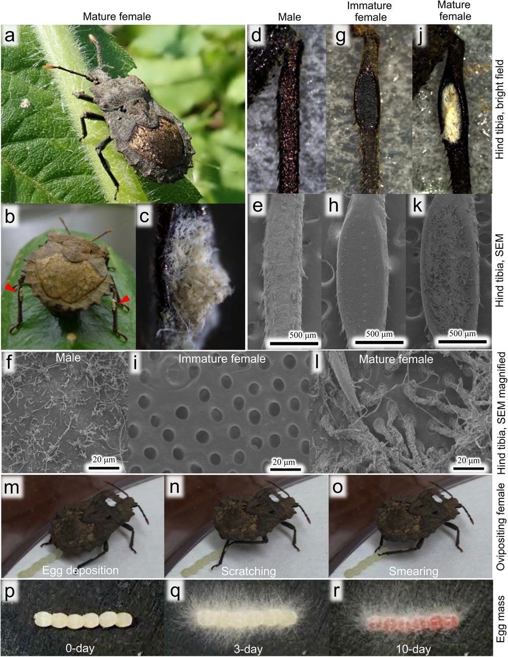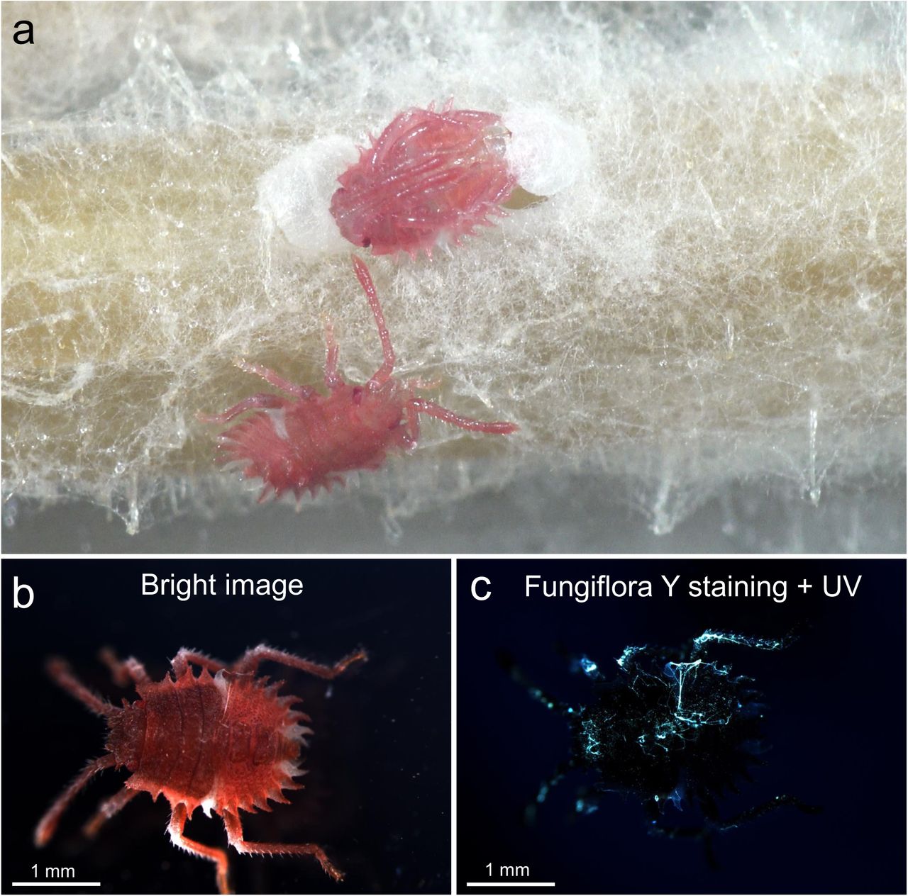 Eközben a laboratóriumban egy furcsa viselkedés keltette fel a kutatók figyelmét. Amikor a nőstények petéket raknak, megállnak, hogy a másik lábuk segítségével megvakarják a lábukon növekvő gombákat, ezután pedig megdörzsölik a lerakott petéket. A gomba pedig megtelepszik azokon, és 3 napon belül körülbelül 2 milliméter vastag réteggel borítja be őket. A petéken növekvő gombák általában rossz jelnek számítanak, de a DNS-szekvenálás kimutatta, hogy a jelen lévő többféle gomba mindegyike ártalmatlan a rovarok számára.