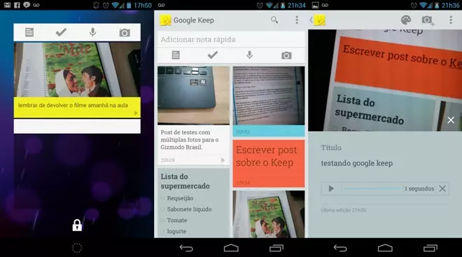 Az androidos app három különböző widget létrehozására ad lehetőséget. Az első és leginkább helytakarékos gyors jegyzeteket készítésére szolgál. A másodiknál már a feljegyzések listáját is látjuk, és görgetve böngészhetjük. A harmadikat pedig az Andrioid 4.2 esetében vehetjük igénybe, ez a lezárt képernyőn fog feltűnni.