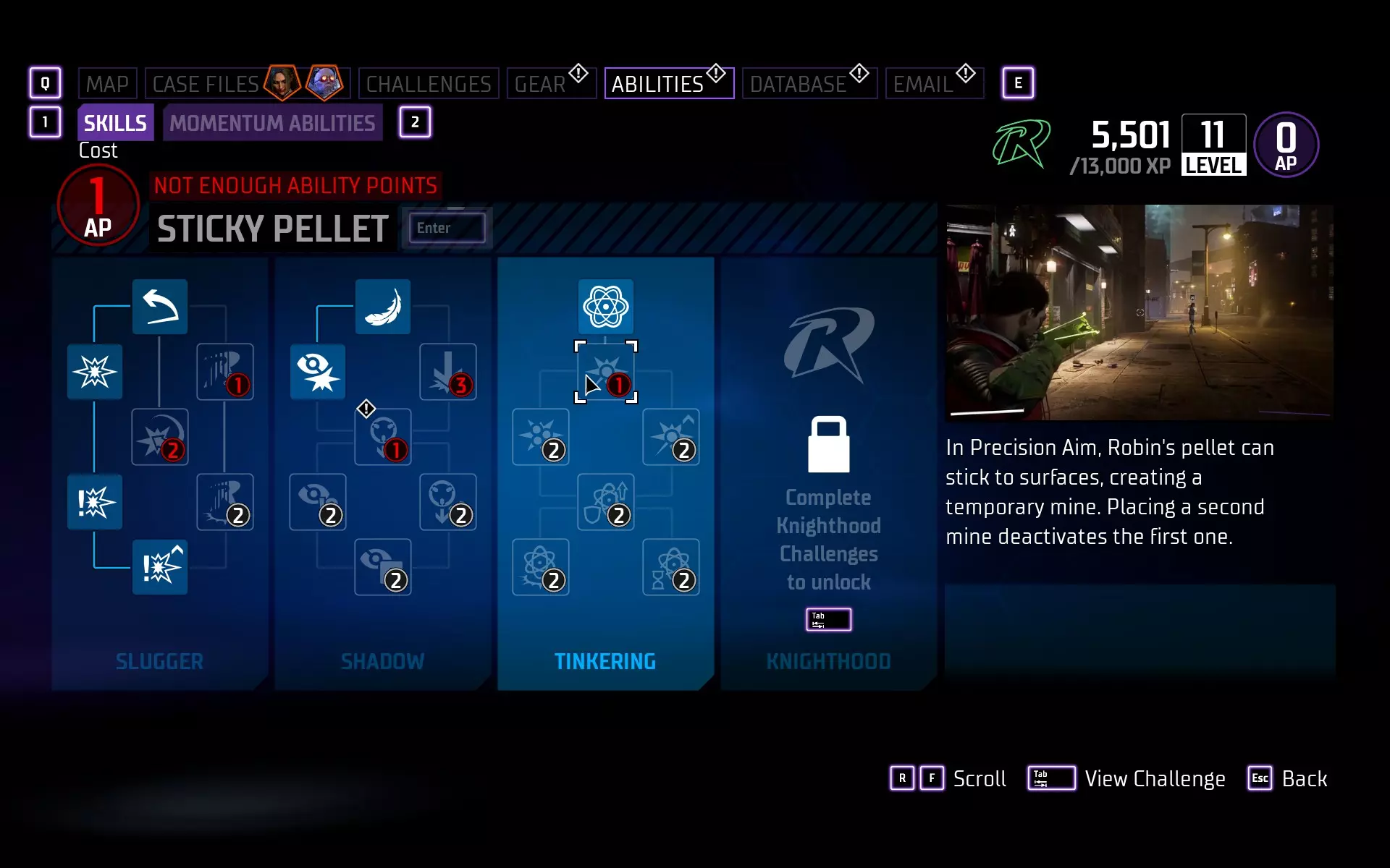 Minél több bűntettet hiúsítunk meg annál több XP és nyersanyag üti a markunkat és annál több lehetőségünk van arra is, hogy a történet különböző részeihez kapcsolódó challenge-eket is kipipáljuk. Mindemellett az elit Knightood skillek eléréséhez is gyúrnunk kell, így ennek az eléréséhez is hasznos ha minél több időt töltünk az utcán.