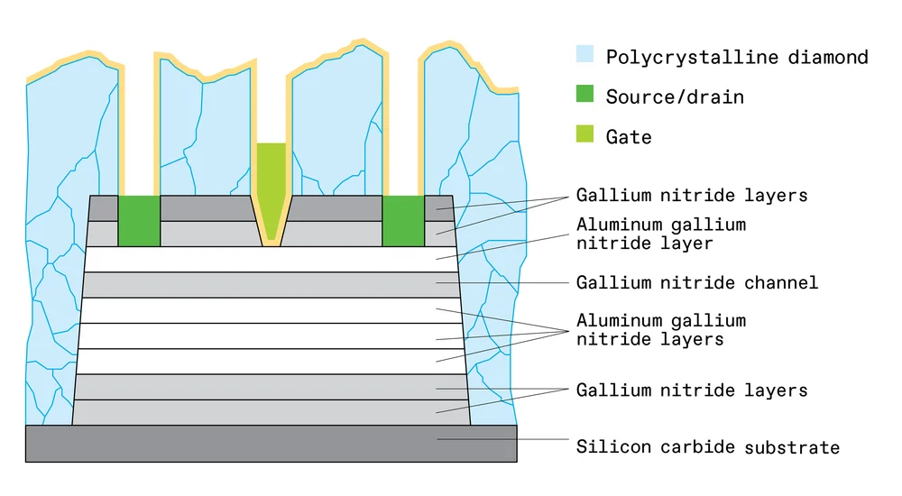 Az IEEE Spectrum beszámolója szerint a hőátadás hatásfokának jelentős mértékű fokozása érdekében a tranzisztorokat vékony gyémántréteggel fedik le, amelyek „növesztése” egyébként magukon a tranzisztorokon történhet a gyártási folyamat során. A szimulált eredmények alapján a chipek hőmérsékletét akár 90%-kal is lehet csökkenteni e módszer révén, míg a gyakorlatba átültetett tesztek azt mutatták, akár 70 Celsius fokos hőmérséklet-csökkenés is elérhető a gyémántréteg alkalmazása mellett a normál állapothoz képest, ami óriási előrelépés.