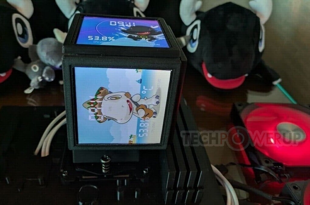 A Bitspower csapata úgy gondolta, kijelzőből sosem elég: készítettek egy kocka alapú processzorhűtőt, ami első ránézésre léghűtésnek tűnhet, legalábbis a formavilága és a mérete miatt, valójában azonban nem tartalmaz ventilátort vagy ventilátorokat. Ahol a ventilátornak kéne lennie, ott egy nagyméretű LCD kijelző pózol, és egy másodikat is elhelyeztek a videokártya felőli részen, egy harmadik pedig a hűtő tetején kapott helyet.