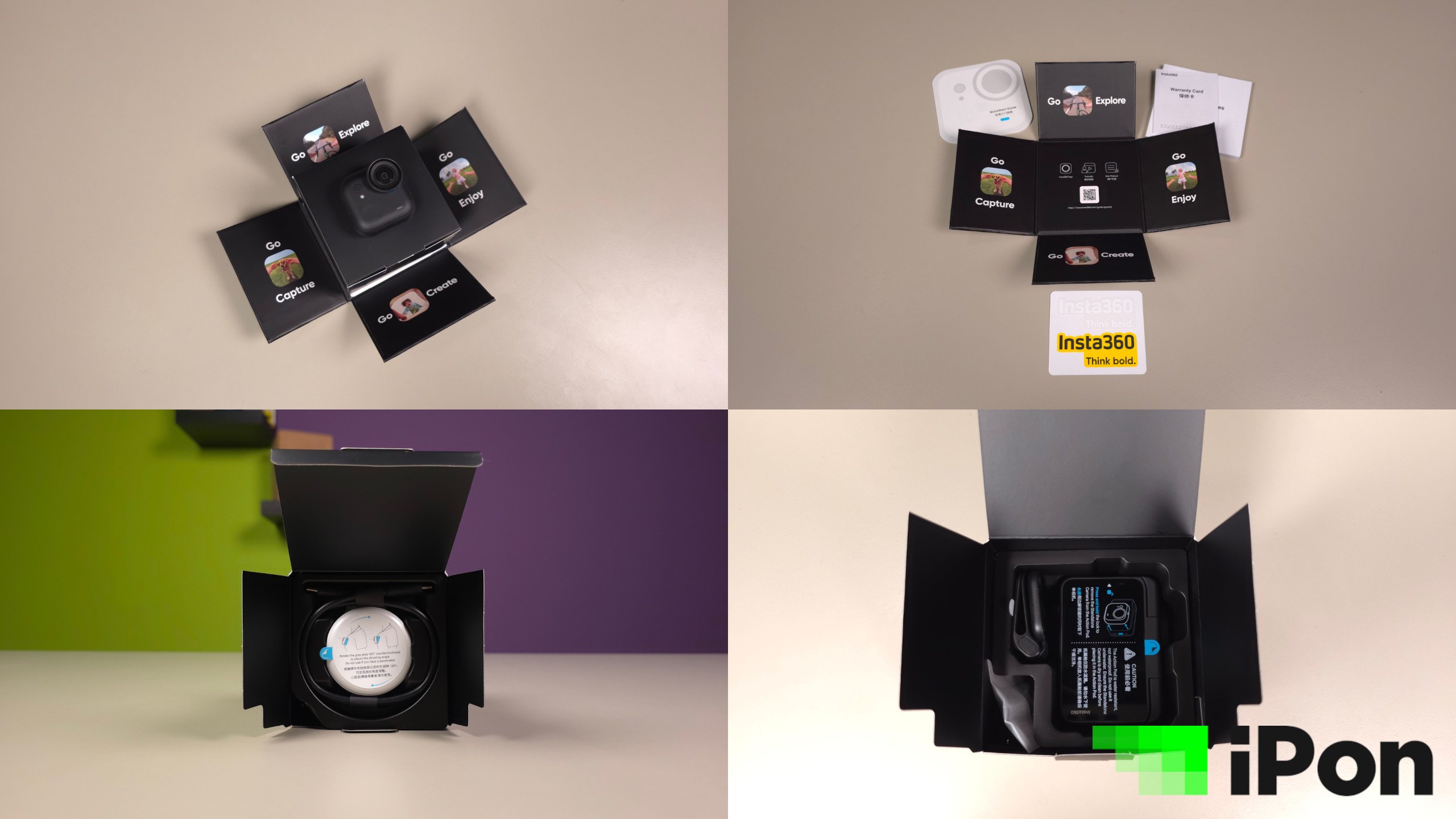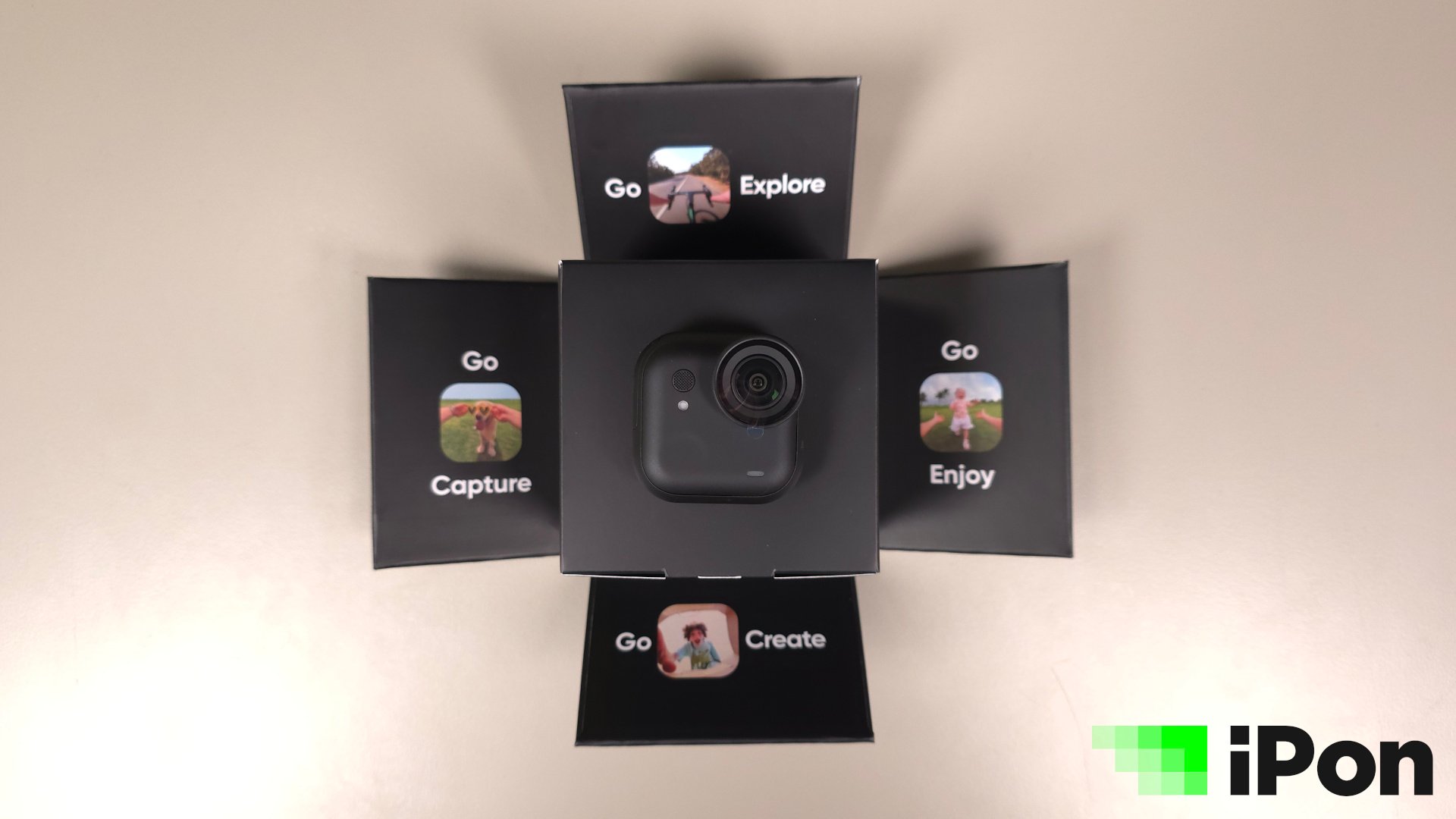 A dobozfedő leemelése után elénk tárul a jópofa belső váz, melynek oldalai oldalra nyithatók, mint egy virág szirmai, középen pedig maga a kamera látható, mely mágnessel kapaszkodik a kiegészítőket rejtő dobozba, illetve a mögötte lévő nyakpántba, mely mindezt lehetővé teszi. A nyakba akasztható extra körül a Type-C adatkábel tekereg egy kis műanyag tálcán, alattuk pedig ott a töltőtok, avagy Pod, egy csipeszes rögzítőelem és egy csuklóra húzható biztonsági madzag leejtés ellen. Az átgondolt és igényes tálalás tehát ezúttal is egyértelművé teszi, hogy prémium kategóriáról van szó, ám hordozásra alkalmas táska, tok vagy tasak sajnos ezúttal sem jár mellé. Déja vu.