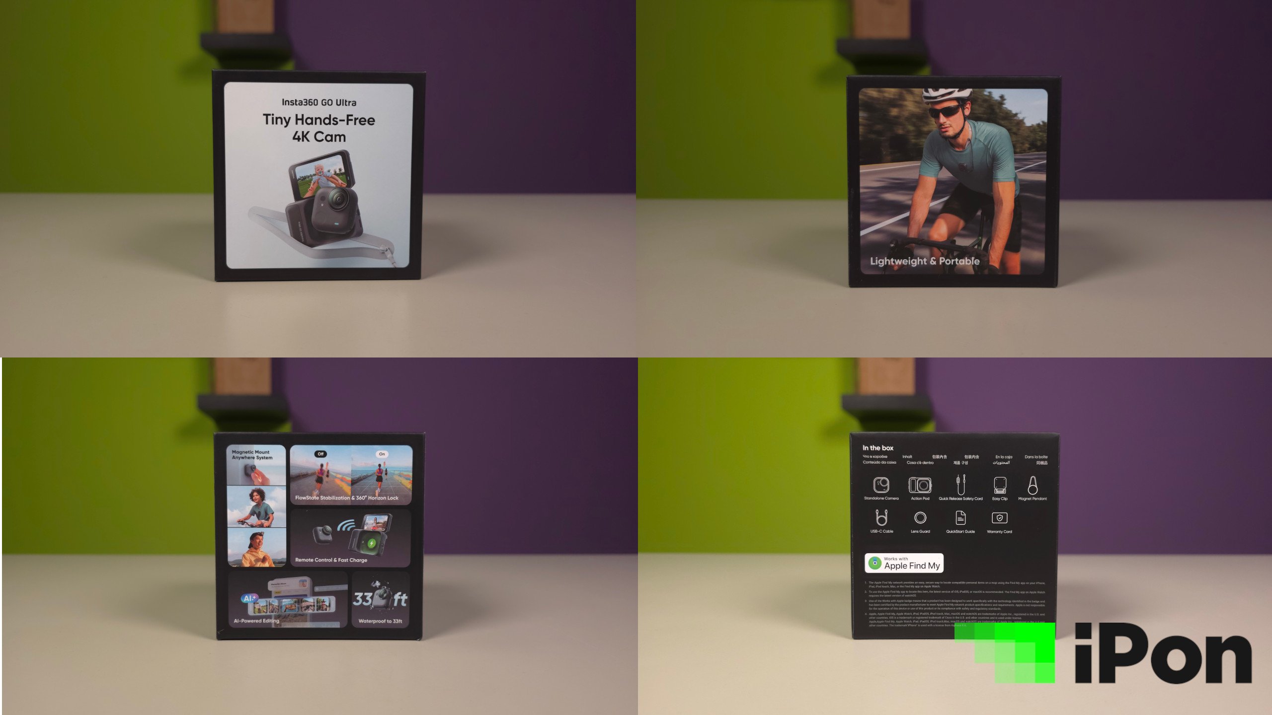 A GO Ultra a gyártóra jellemző következetes igényességgel került tálalásra, tehát ismét itt a kemény kartonból épített fekete dobozka, mely ezúttal alapcsomag lévén kis négyzetet formáz. Körbeforgatáskor olyan vonzó tulajdonságokat hirdet, mint a 4K60FPS, a távirányítási és gyorstöltési képességek, a mágneses rögzíthetőség, a vízállóság és a horizontkövetés. A hátoldal a készlet tartalmát árulja el, mely alapcsomag lévén nem nyújt sok meglepetést, de azért rálicitál egy sima USB-s vezetékre, szóval nem nélkülözi a legfontosabb alapkellékeket.