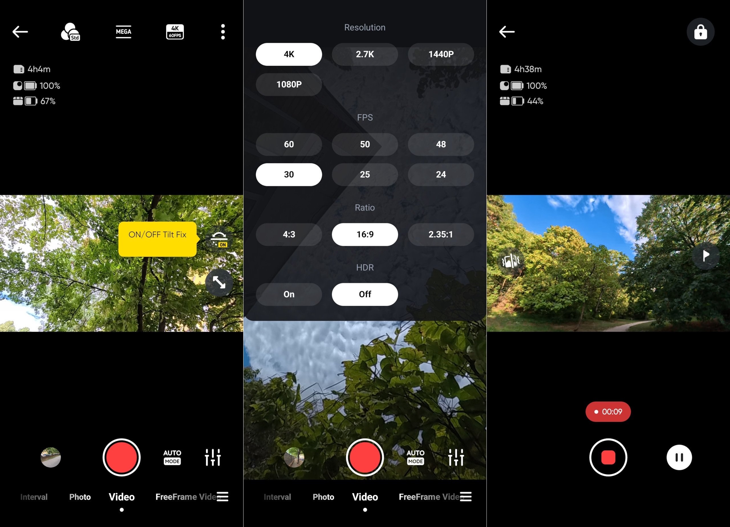 A kamera továbbra is a Pod érintőkijelzőjén gesztusvezérléssel, vagy a telefonos applikáción keresztül kezelhető. A Pod ráadásul megteszi azt a szívességet, hogy távirányítóként is kiválóan működik, tehát a kamerát bárhová is rögzítettük, a beépített WiFi-nek hála a képernyő aktív marad és így minden beállításhoz hozzáférünk. Ha nagyobb képernyőre vágyunk és épp nem edzünk vagy sportolunk, töltsük le az Insta360 applikációt és ott is molyolhatunk a képbeállításokkal vagy indíthatunk és zárhatunk felvételt.