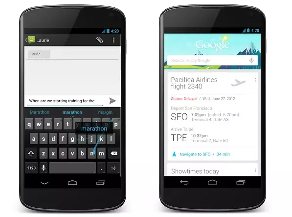 Ám a Nexus 4 lényege maga az Android. Ez ugyanis az a referencia modell, ami a Jelly Bean 4.2-es kiadását hivatott terjeszteni. A 4.2-vel jön többek közt a Google Now továbbfejlesztett változata. Ez a "személyi asszisztensként" szolgáló alkalmazás minden eddiginél több információval lát majd el minket, amik nagyban megkönnyíthetik a mindennapjainkat. Továbbá kiemelendő a Photo Sphere, mellyel gömbfotókat hozhatunk létre egyszerűen a 8 megapixeles kamera segítségével. Valamint fontos az is, hogy az értesítési sávban mostantól több gyorsbeállítás funkció érhető el. A lezárt képernyő is szerepet kapott az újítások között, ide kitehetőek a legsűrűbben használt widgetek a gyorsabb elérés érdekében. A beviteli lehetőségek között pedig egy Swype-szerű módszerrel gazdagodtunk.