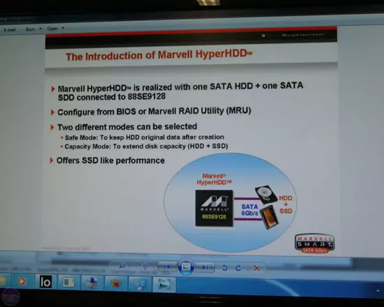 A Marvell egy meglehetősen furcsa újítással jelentkezik, ami tulajdonképpen nem más, mint egy ingyenes segédprogram, amely HyperHDD névre hallgat. A szoftvert a vállalat 6 Gbps-os SATA portokat kínáló 88SE9128-as kódnévvel ellátott vezérlőihez lehet használni, amely számos közép- és felsőkategóriás alaplapon jelen van. A megoldás lényege ez, hogy ha a vezérlőre egy merevlemezt és egy SSD meghajtót kapcsolunk, akkor a szoftver segítségével beállíthatjuk, hogy az adattárolók együttműködjenek, ezáltal ötvözhetjük a két rendszerben rejlő pozitív tulajdonságokat.