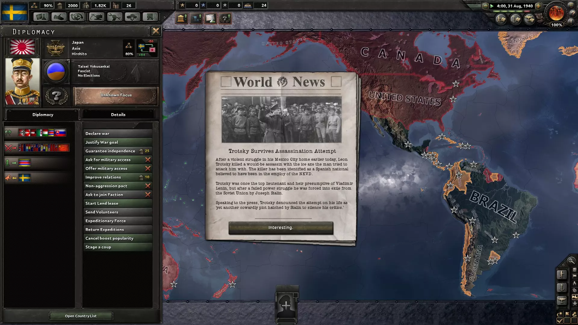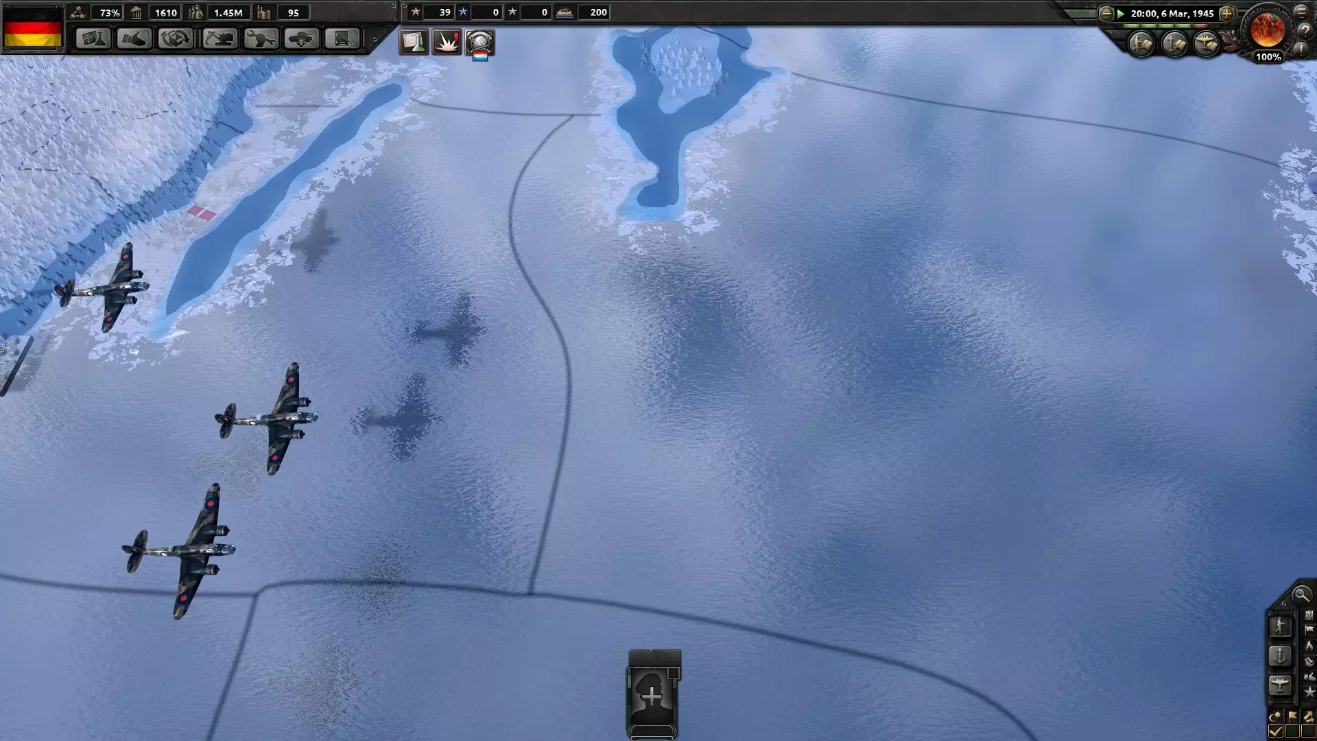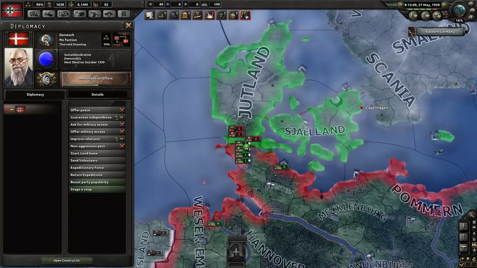 Mindez viszont nem sokáig tartott, mert Hitler meggyilkolása után Göring ragadta magához a kormánykereket és elődjénél kétszerte vehemensebben borította lángba a kontinenseket, tehát valamit lépnem kellett, mert nem várhattam ölbe tett kézzel a véget. Ügyes diplomáciával elértem, hogy engem ne rohanjon le, a biztonság kedvéért Angliával is javítottam a viszonyomon, miközben pedig biztos ami biztos alapon kiképeztem pár egységet a haza védelmére és reménykedtem a legjobbakban. Magától értetődik, hogy csalódnom kellett: a Szovjetunió inkább Japánt támadta Németország helyett, Roosevelt pedig elvesztette az elnökválasztást és az utódja nem égett a vágytól, hogy bármit is csináljon. Ott ültem tehát a forrongó pokolban, az Anglia vezette szövetségesek és a nácik között őrlődve. A kínos szituációt végül a szigetország oldotta meg, amely garantálta a védelmemet, ezért a viharfelhő elvonult a fejem felől.