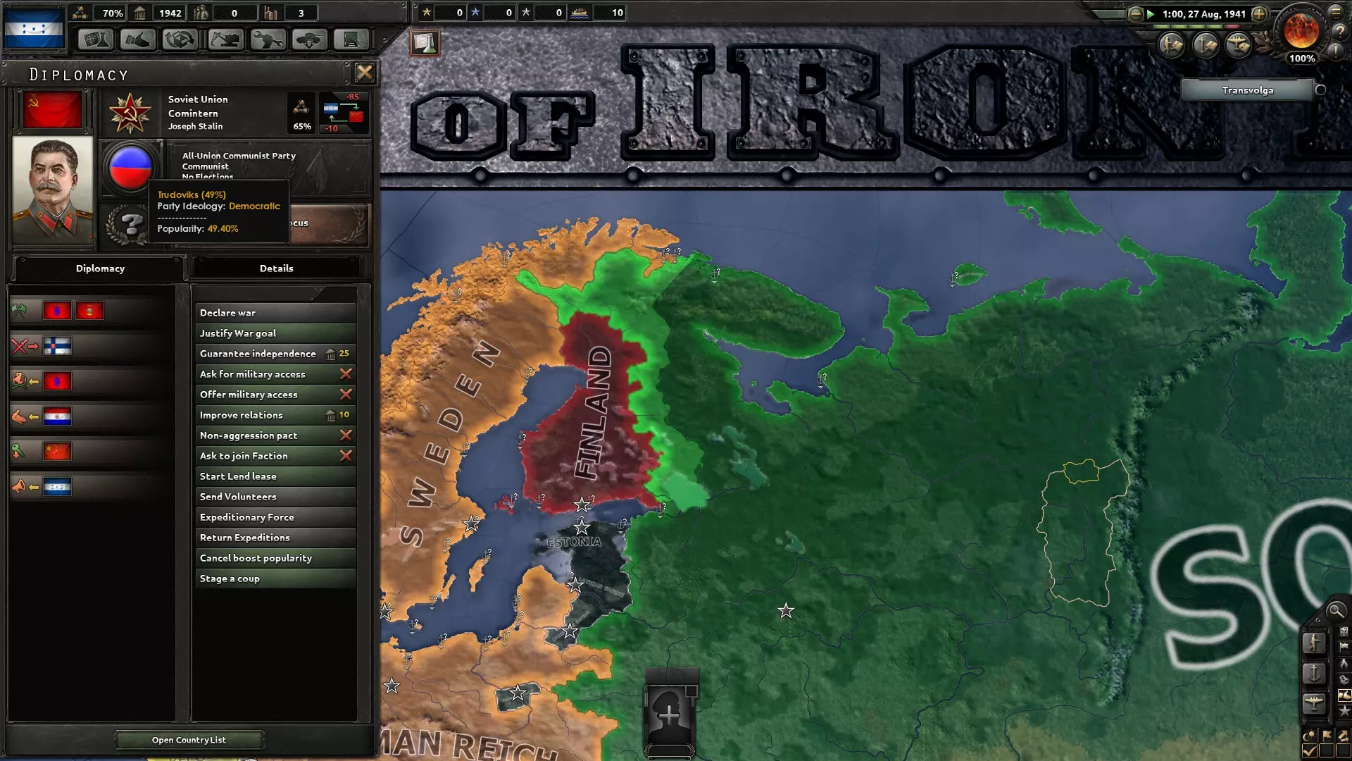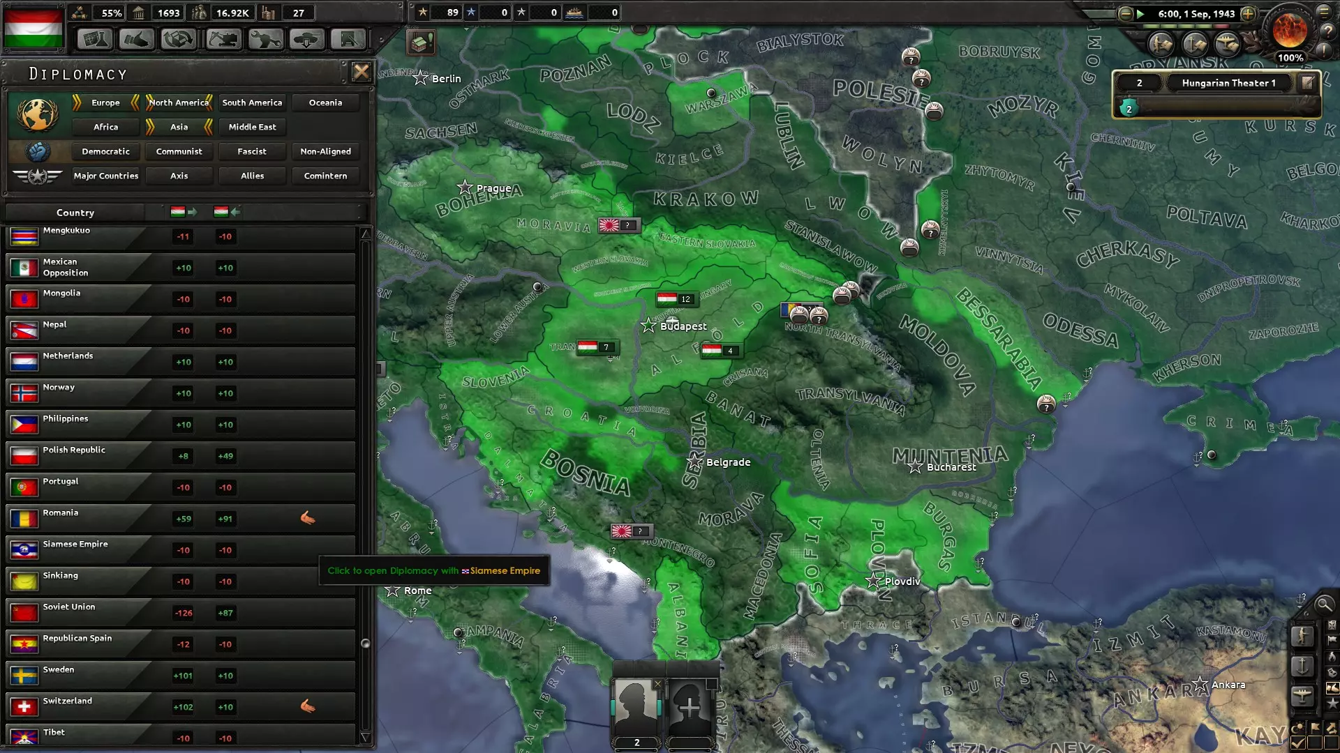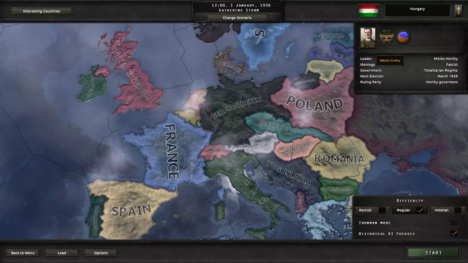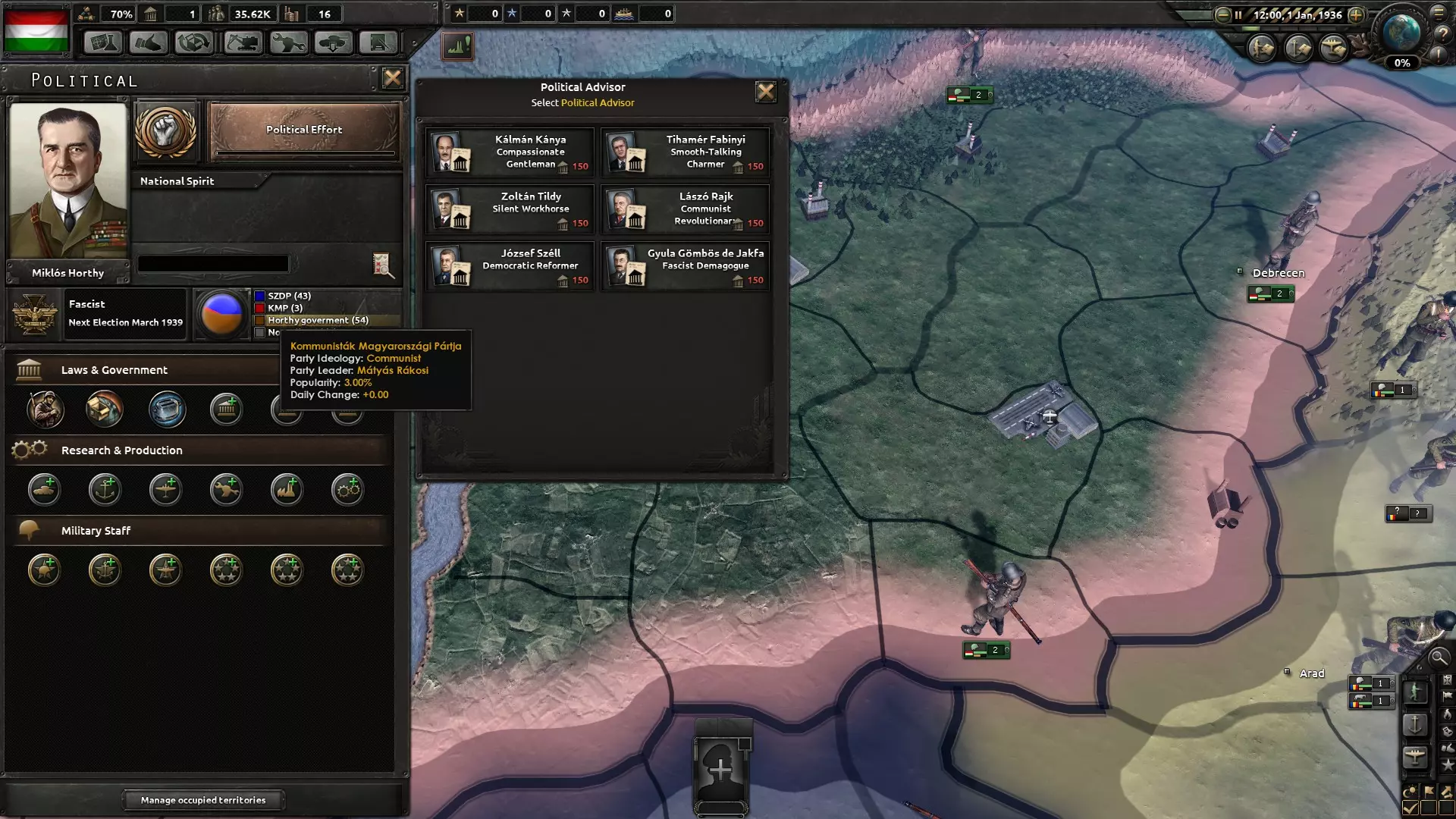 Az első végigjátszás-próbálkozásom során értelemszerűen Magyarországot választottam és kipróbáltam, hogy vajon miképpen alakult volna hazánk sorsa, ha nem németbarát vezetősége van, hanem egy olyan, amelyik szeretné elkerülni a vérfürdőt. Horthy rövid úton kénytelen volt átadni az ország vezetését a demokratikus frakciónak, amivel ezt követően megpróbáltam nem belefolyni az érdekcsoportok közötti csörtébe.