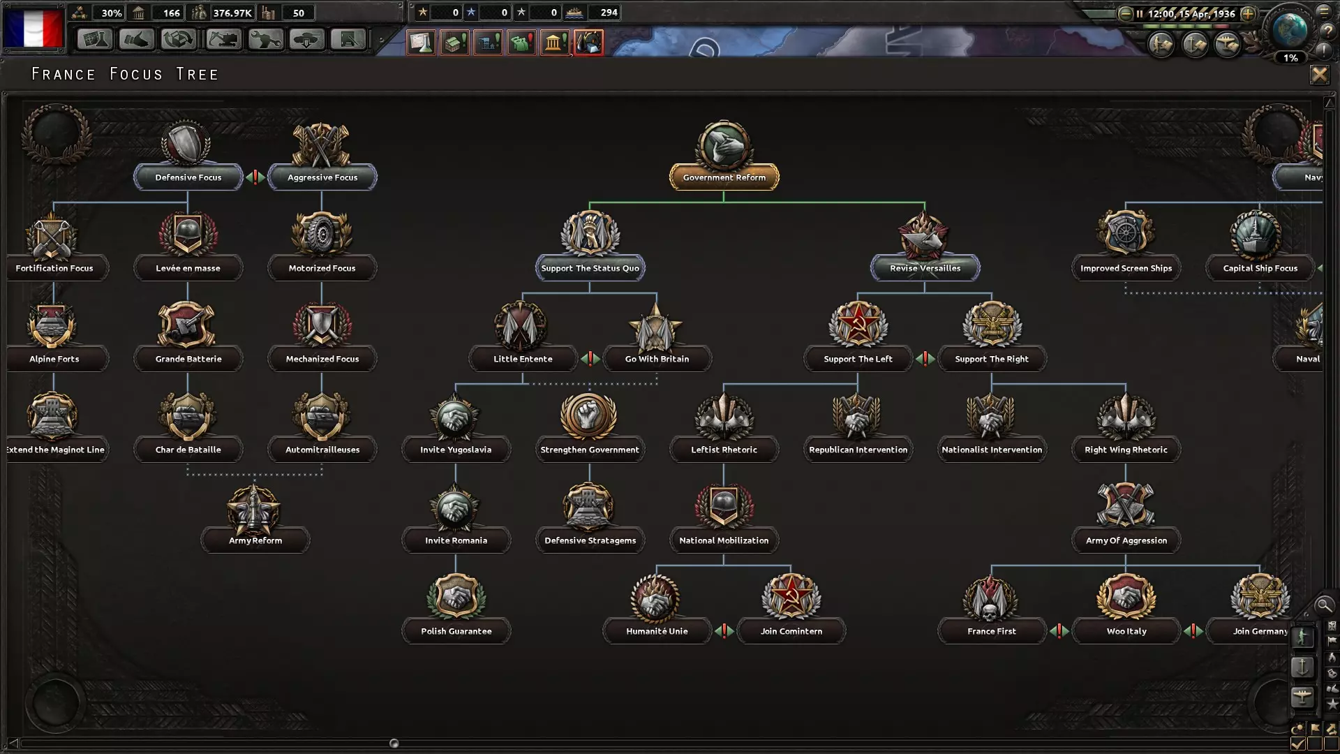 Egyfelől kutathatunk különféle technológiákat, de nem árt észben tartanunk, hogy ha valami olyat akarunk kifejleszteni, ami az adott esztendőben még nem volt elérhető, akkor a kitűzött célt tovább tart elérnünk, mint normális körülmények között. Másfelől vannak különféle nemzeti célok. Ezek a nagyobb országoknál egyénileg kidolgozott, nemritkán történelmi eseményeket jelölnek, mint az antikomintern paktum, vagy Marco Polo hídi incidens. A célok a fejlesztésekhez hasonlóan bizonyos esetekben ütköznek egymással, ezért vagy az egyikkel, vagy pedig a másikkal kell beérnünk és rendszerint valamiféle bónuszt adnak, vagy éppen okot a háborúra. Fontos ugyanis, hogy más játékokkal ellentétben alapesetben nem lehet csak úgy lerohanni valakit, hanem valamiféle ürügyet kell kreálnunk a konfliktus kirobbantására. Ehhez a politikai befolyásunkat kell felhasználnunk, ami egyike a játék legfontosabb erőforrásainak, mert nem csak a hadi lépéseinket fogadtathatjuk el a felhasználásával a közvéleménnyel, hanem a kormányunk átalakításához és a gazdaság motorjának átalakításához, vagy éppen a hadkötelezettség új alapokra helyezéséhez is fel kell használnunk.
