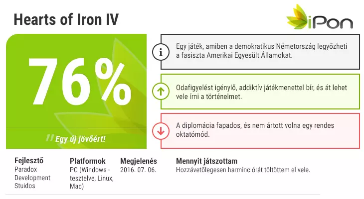 A Hearts of Iron IV lényege is az alternatív múlt, mert a grand strategy műfajt erősítő címben lehetőséget kapunk arra, hogy kedvünk és persze tudásunk szerint alakítsunk a második világháború menetén. Így kipróbálhatjuk, hogy miképpen alakultak volna az erőviszonyok, ha az Egyesült Királyságban a fasiszta eszmék győznek, ha Japán sosem bombázza le Pearl Harbort, ha a Szovjetunió a demokratizálódás útjára lép, vagy ha Franciaország sikeresen visszaveri a német hadakat és a diadalon felbátorodva agresszív terjeszkedésbe kezd a kontinensen.