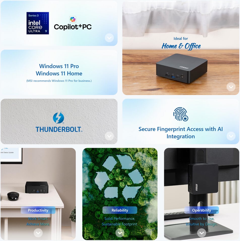 Az egyszerű dizájnnal rendelkező ház belsejében Intel Core Ultra 9 386H, Intel Core Ultra 7 355, vagy éppen Intel Core Ultra 5 322 típusú processzor kaphat helyet, ezek sorrendben 16, 8, illetve 6 processzormaggal rendelkeznek, viszont mindegyikük kapott egy kellően ütőképes NPU-t is, ami megfelel a Microsoft Copilot+ PC kategória igényeinek. Az MSI szerint az új asztali PC kiválóan bevethető helyi AI feladatok gyorsítására, de akár irodai munkára, üzleti feladatokra, illetve digitális információs pontként is használható.