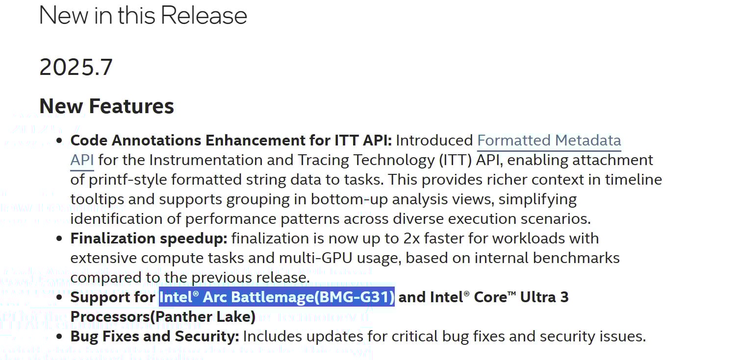 A BMG-G31-es grafikus processzorral, ami egyebek mellett az Arc B770-es modell alapját adná, nemrégiben futott be némi extra információ: ezt a grafikus processzort immár támogatja a VTune Profiler szoftver legújabb változata. A szóban forgó szoftver a Panther Lake processzorok mellett, amelyek a Core Ultra 3-as szériát erősítik, a Battlemage BMG-G31-es grafikus processzort is kezeli már, ami arra utalhat, hogy ha nem is az év negyedik negyedévében – aminek mindjárt vége is van –, de a következő év elején akár már be is mutatkozhat a régóta várt gamer videokártya.