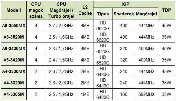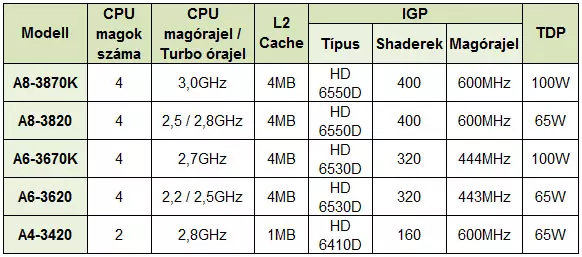 A fenti processzorok többsége kétcsatornás, DDR3-1866 MHz-es memóriatámogatást kínál, míg az A4-3420-as APU esetében be kell érnünk DDR3-1600 MHz-es memóriatámogatással. Az A8-3870K, A8-3820, A6-3670K, és az A6-3620 processzorok 100 MHz-cel magasabb magórajelen ketyegnek, mint A8-3850, A8-3800, A6-3650, és A6-3600-as elődeik.