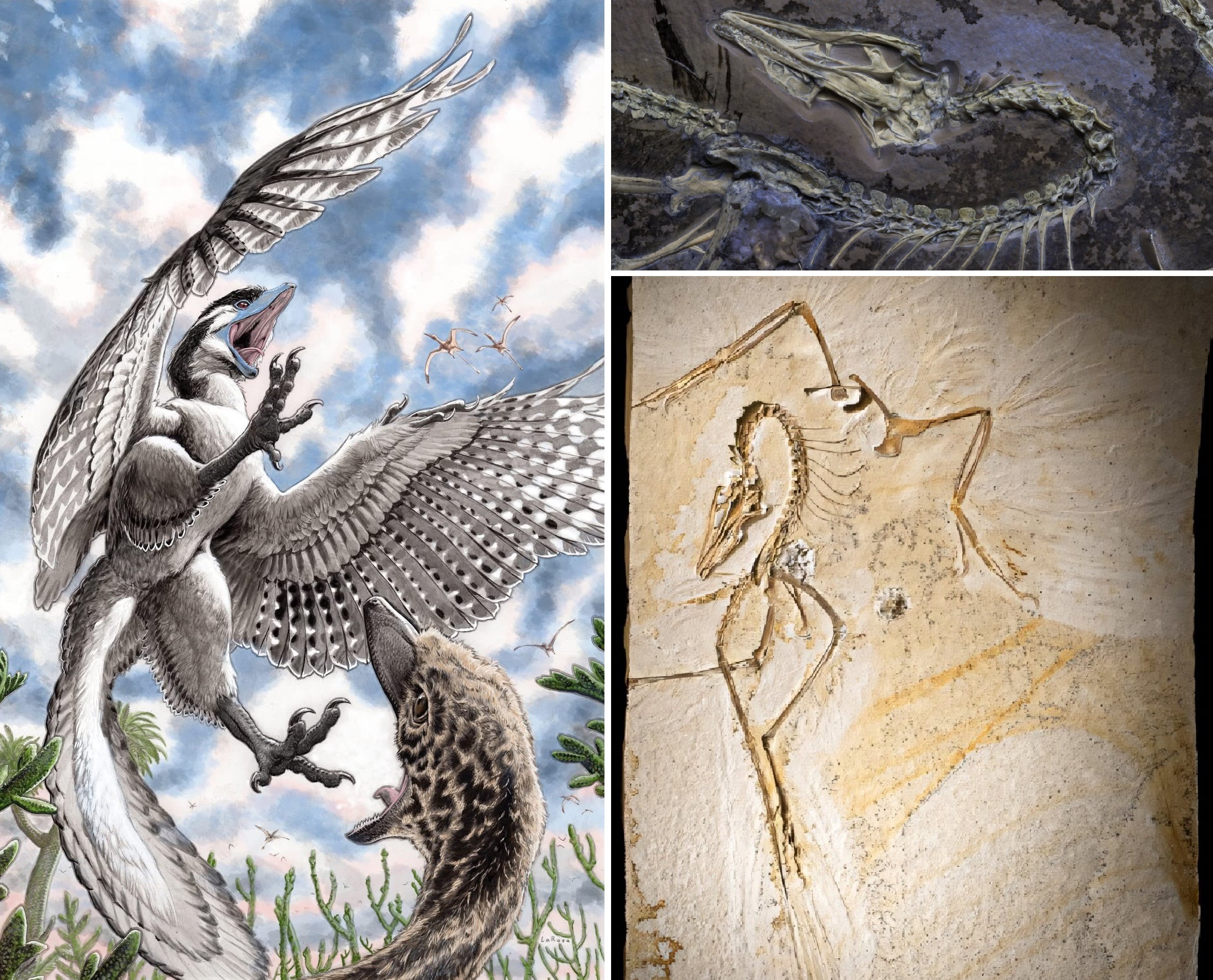 Két fosszília kulcsfontosságú ebben a narratívában. Az első a Microraptor, a Jehol biótából, amelyet először Xing Xu és kollégái írtak le 2003-ban. A Microraptor egy kis dinoszaurusz volt, amely elülső és hátsó végtagjaival repült, vagyis két szárny helyett négy szárnya volt. Ez annyira eltér a madarak repülési módjától, mondja O’Connor, hogy egy független evolúciós eredetre utal.