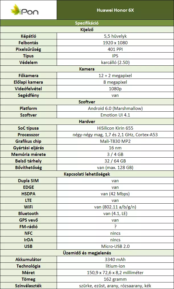 A Huawei nagy hangsúlyt fektet a saját központi chipjeinek fejlesztésére, és a Honor 6X is ennek az eredményét hordozza. A 16 nm-es csíkszélességen készülő HiSilicon Kirin 655 dolgozik benne, ami a Kirin 650 emelt órajeleken üzemelő változata. Ebben a lapkában a teljesítményért felelős Cortex-A53 egységek már 2,1 GHz-ig skálázódhatnak, míg a hatékonyságot szem előtt tartó megoldásoknak a frekvenciája 1,7 GHz lehet; a grafikus feladatokért ugyanúgy egy Mali-T830 MP2 kezeskedik, mint korábban. A Honor 6X összesen három különböző konfigurációban lesz elérhető a tárhelyet és a rendszermemóriát figyelembe véve. Az alapmodell 3 GB-nyi RAM-mal jön, amihez 32 GB háttértár tartozik majd, eggyel felette foglal majd helyet a már 4 GB memóriával, de még továbbra is 32 gigás hellyel szolgáló variáns, a legjobb kivitele pedig már 64 GB-nyi eMMC 5.1 adattárolót nyújt a 4 GB RAM mellett. Bővítési lehetőséggel mindegyik példány tud szolgálni. A kapcsolati opciók terén jelenlegi információink szerint sok kiemelendő dolog nincs, csak a 4G LTE hálózati modem van benne jelen, amit a VoLTE támogatás valamelyest érdekessé tesz, de az árkategóriájában már ez is mindennapos. Egyébként kettő SIM kezelésére lett felkészítve az eszköz, de hibrid, így ugyanazon a sloton fog osztozni a microSD és a második Nano SIM.