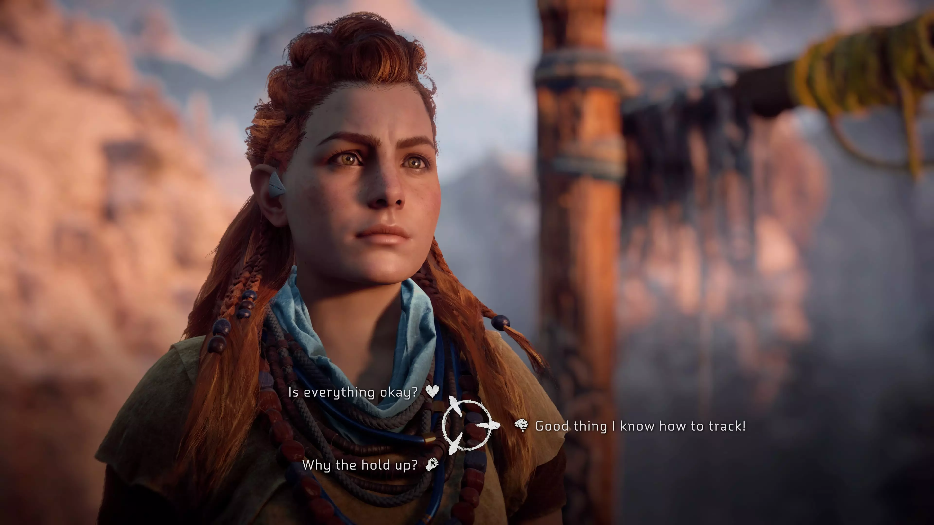 A fő és mellékküldetések szerintem érdekesek, nem olyan jellegűek, hogy egy paraszt az út szélén azt kéri, hogy hozzunk el vagy gyűjtsünk össze neki valamit. Sokkal inkább olyanok, amik által több ismeretet szerezhetünk a világról és annak lakóiról. Gyakran kell bennük például nyomokat követni vagy „detektív” munkát végezni, amiben segítségünkre van Aloy fókusza, egy afféle régi időkből visszamaradt „Google Glass”. Ez, ha aktiváljuk képes megmutatni a robot ellenfelek járőr útvonalait, szép rózsaszínen kivilágítja a földben található nyomokat, illetve mutatja az ellenfelek gyenge pontjait is. A fókusz kicsit olyan kütyü, mintha csak Batman repertoárjából nyúlták volna ki, de mégis minden szempontból jól beleillik Aloy felszerelésébe.